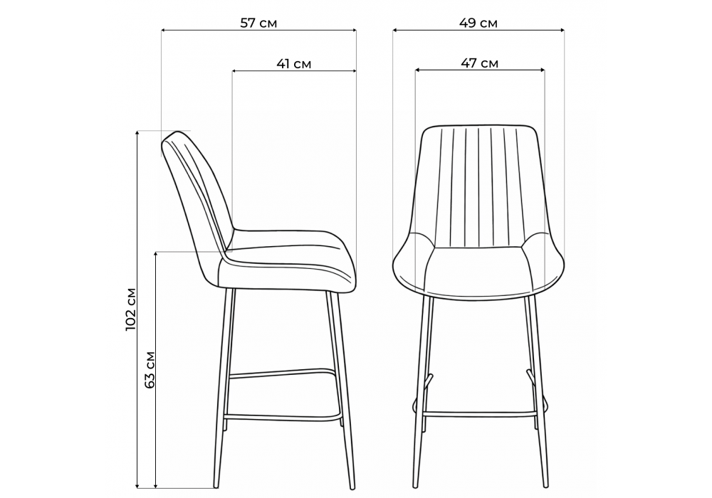 Материал каркаса - металл; Материал сиденья - велюр; Материал обивки - велюр; Ширина - 49; Глубина - 57; Высота - 102; Ширина сиденья - 47; Глубина сиденья - 41; Высота сиденья - 63;