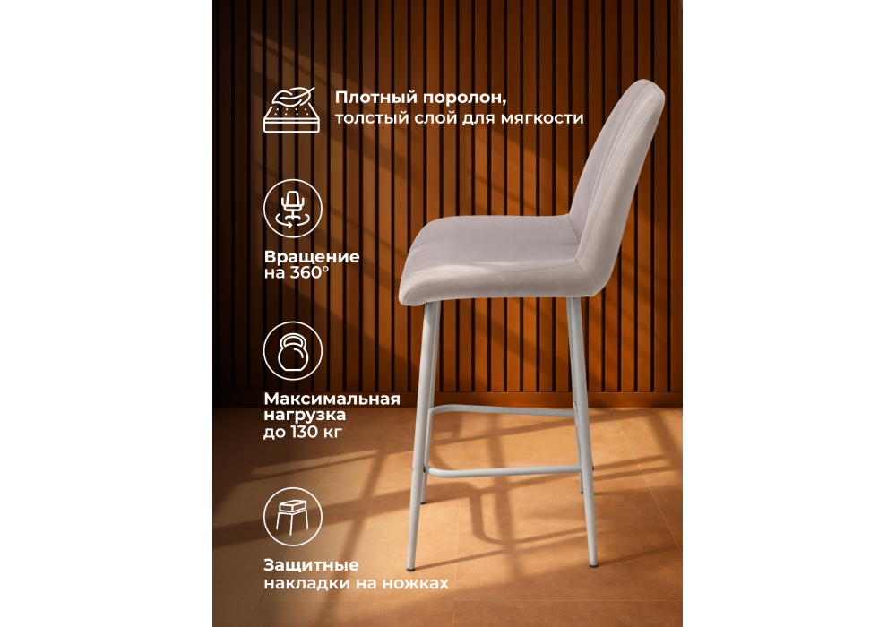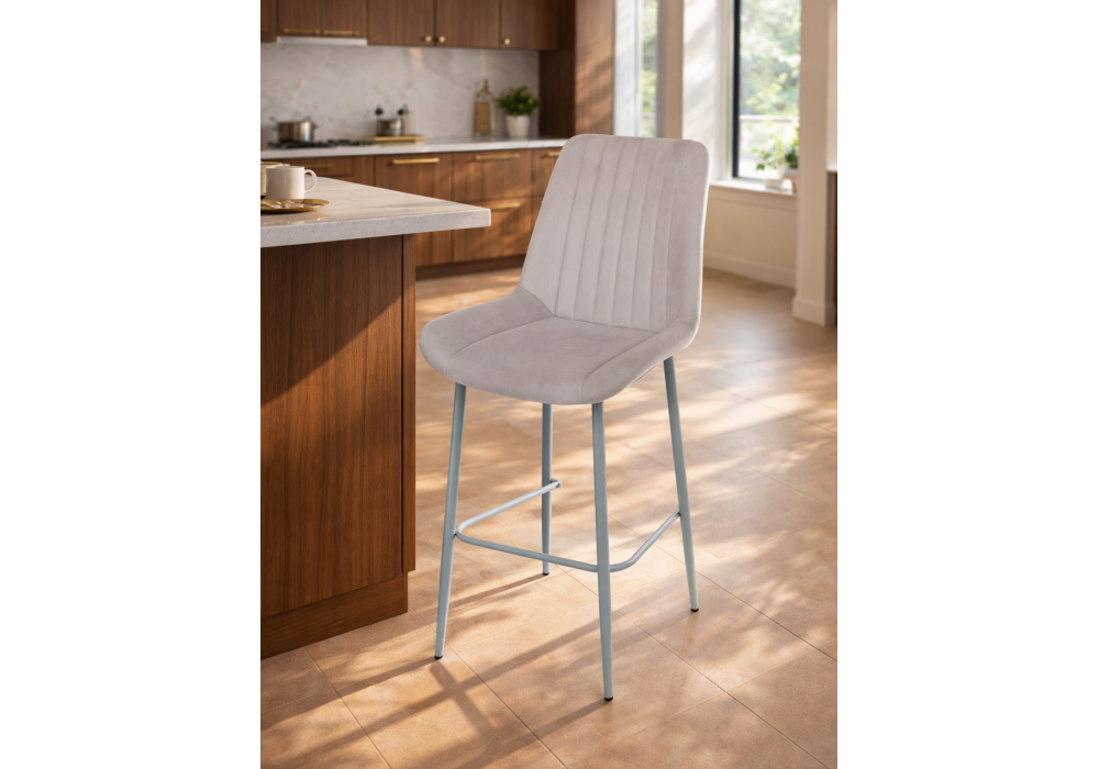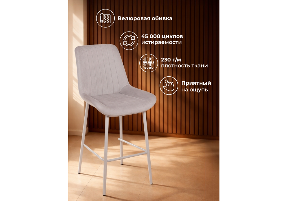 Материал каркаса - металл; Материал сиденья - велюр; Материал обивки - велюр; Цвет ножек - серый; Ширина - 49; Глубина - 57; Высота - 102; Ширина сиденья - 47; Глубина сиденья - 41; Высота сиденья - 63;