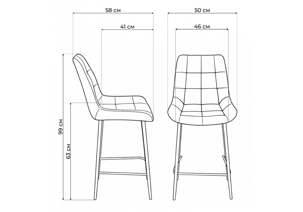 Материал каркаса - металл; Материал сиденья - велюр; Материал обивки - велюр; Цвет ножек - черный; Ширина - 50; Глубина - 58; Высота - 99; Ширина сиденья - 46; Глубина сиденья - 41; Высота сиденья - 63;