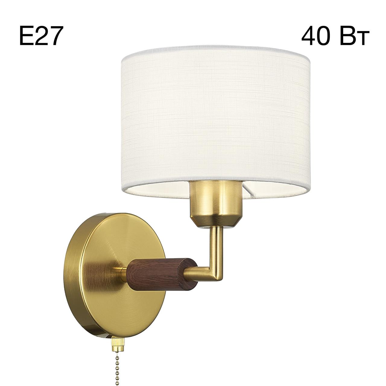 Бронзовый металлический каркас с декоративными элементами с текстурой под дерево. Один рожок с абажуром в форме цилиндра, изготовленного из молочно-белой ткани с чуть шероховатой текстурой.