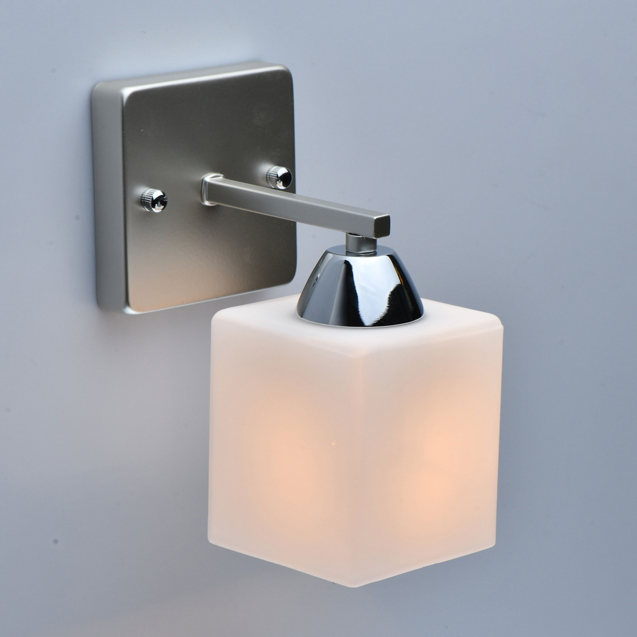 Геометрические формы основания поддержаны кубической формой плафона Актуальная комбинация металлов цвета перламутрового серебра и глянцевого хромаПлафон матового белого стекла создает мягкое освещениеПолная семья из бра, светильников на 4 и 8 ламп