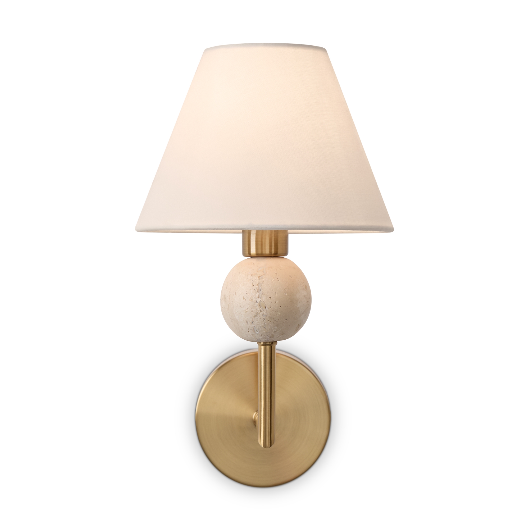 Материал арматуры — металл. Цвет металла — латунь. Абажуры выполнены из белой ткани, которые мягко рассеивают свет. Потолочные и настенные светильники с цоколем E14. Декоративные элементы в форме шара на плафоне выполнены из травертина. Металлическая форма арматуры строгой геометрической формы с пластинами из латуни. Подходит для оформления элегантных классических пространств. Данную модель FR2043WL-01BS спешите купить с быстрой доставкой в магазине 220svet.ru