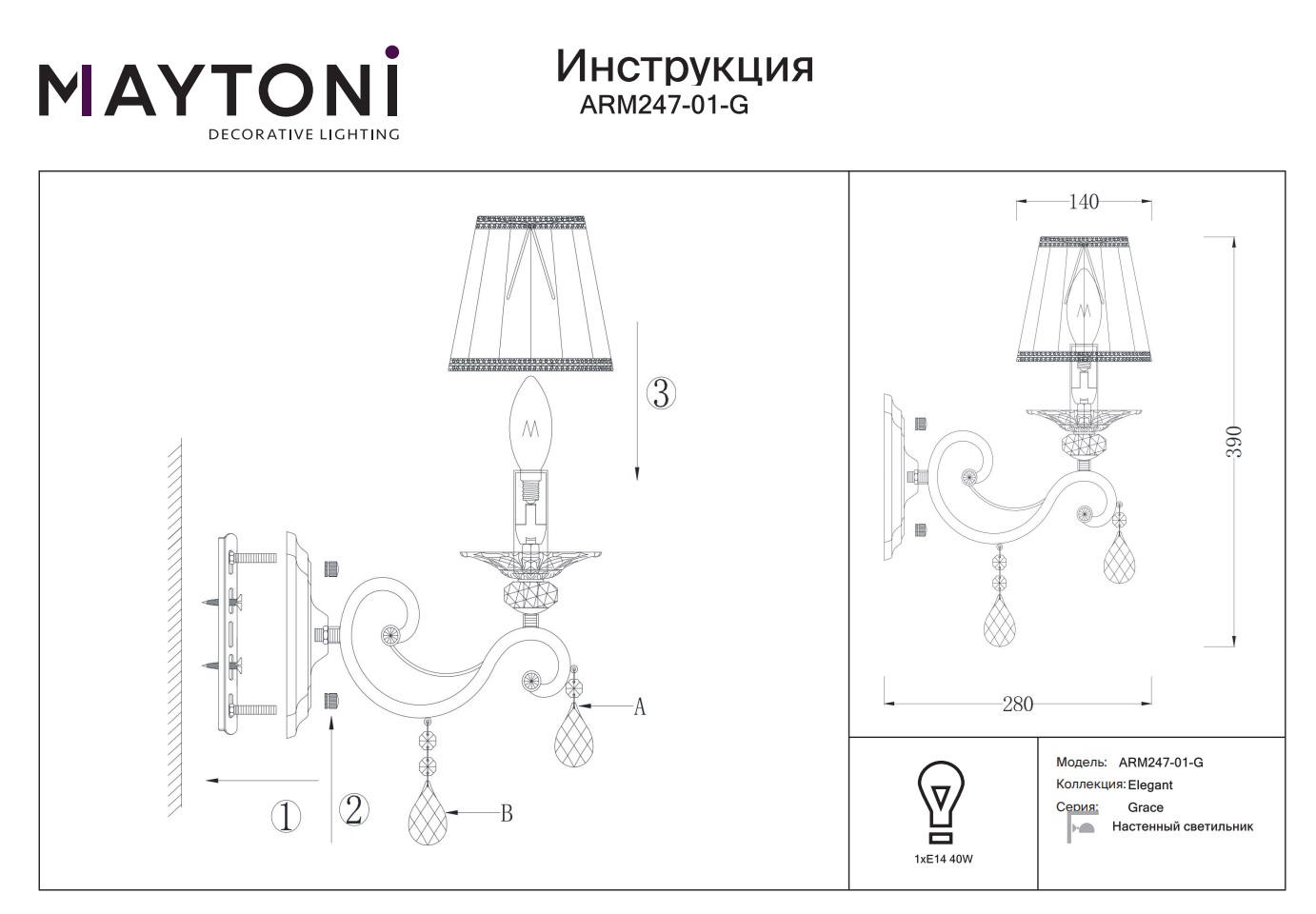 Maytoni Grace ARM247-01-G — это идеальный выбор для тех, кто ценит красоту и комфорт в своём доме. Светильники данной серии станут изюминкой любого интерьера и подчеркнут вашу индивидуальность.
