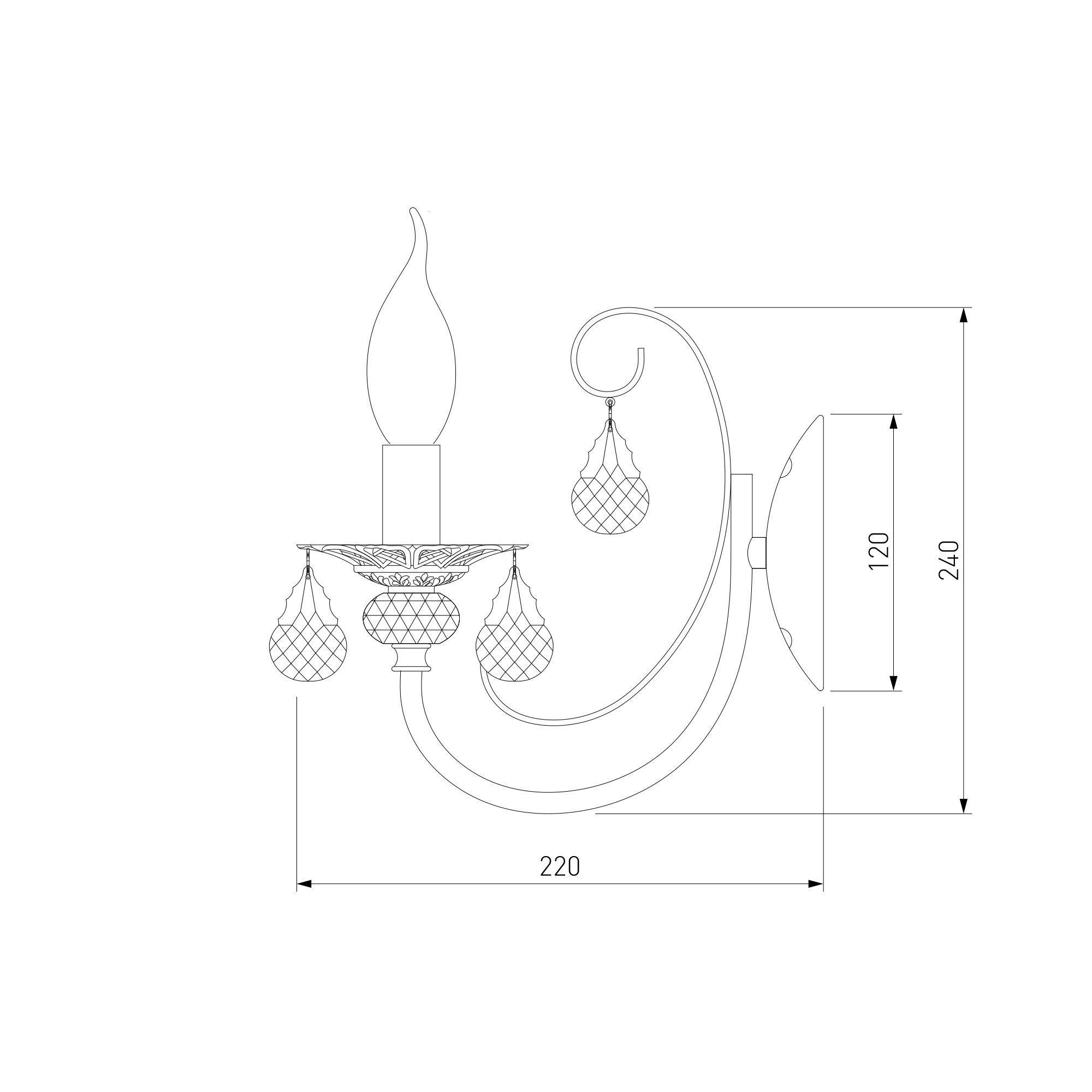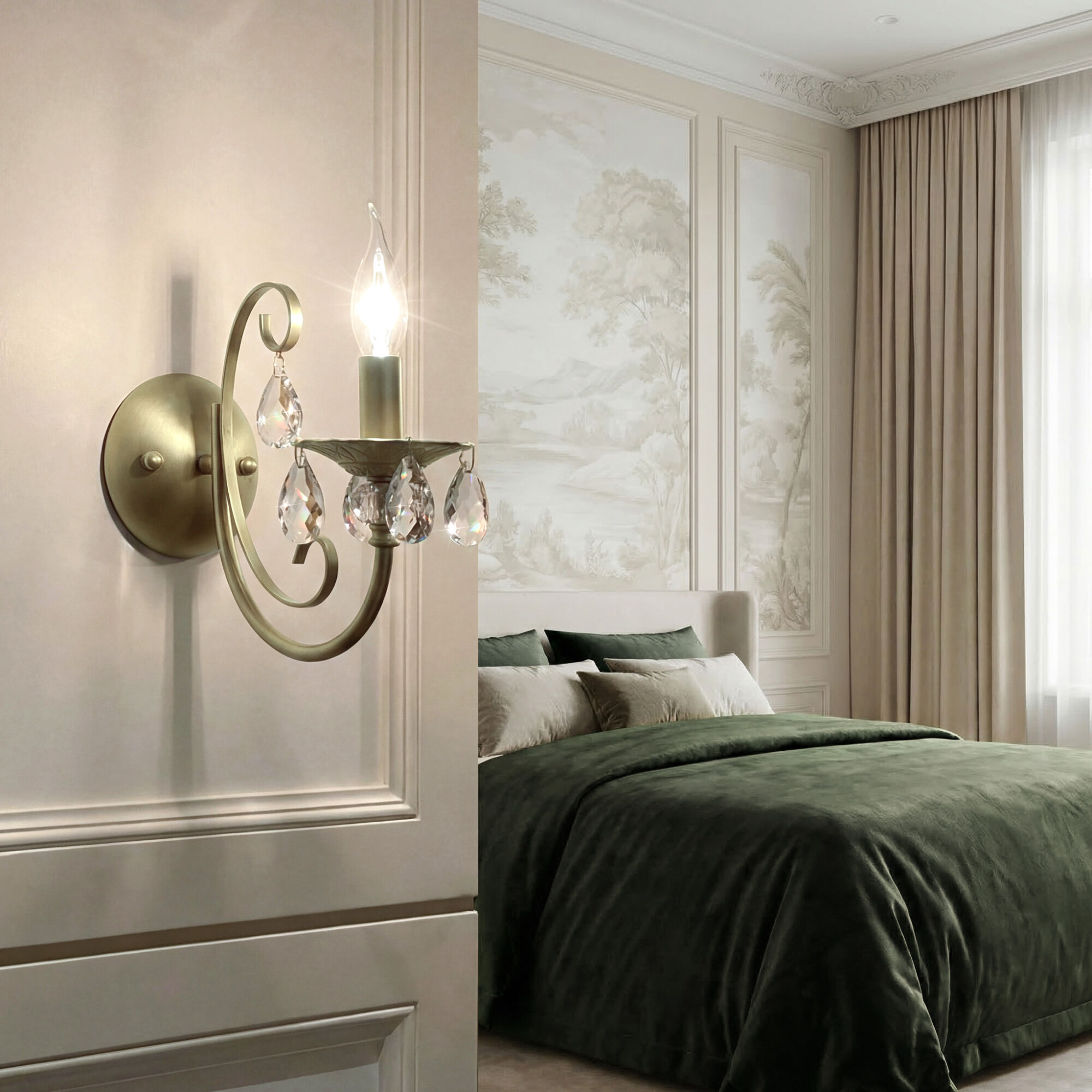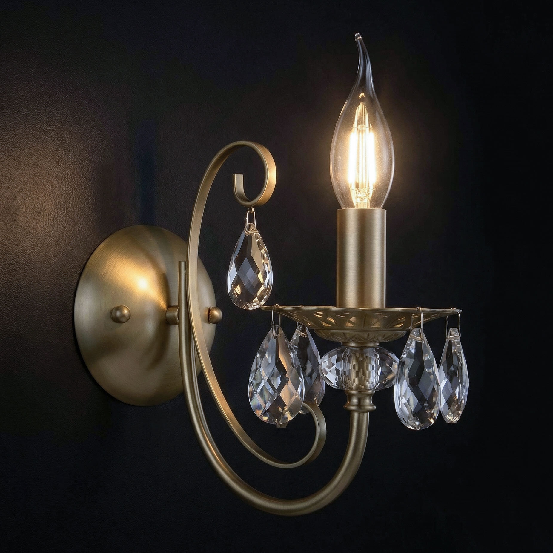 Классический настенный светильник 3305/1 — словно отголосок эпохи дворцовых балов. Латунная арматура с изящными вензелями мягко мерцает в свете, а бесцветный хрусталь ловит и преломляет каждый луч, рассыпая по стенам россыпь бликов.