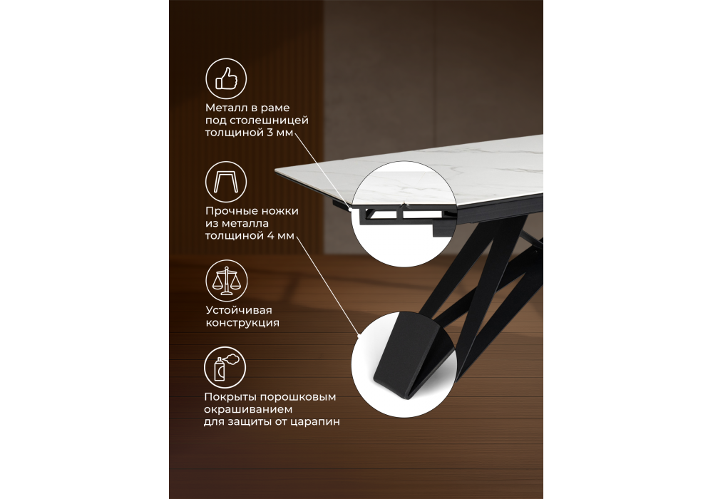Материал каркаса - металл; Материал столешницы - Керамика; Ширина - 89; Высота - 73; Длина стола в разложенном виде - 220; Длина - 160;