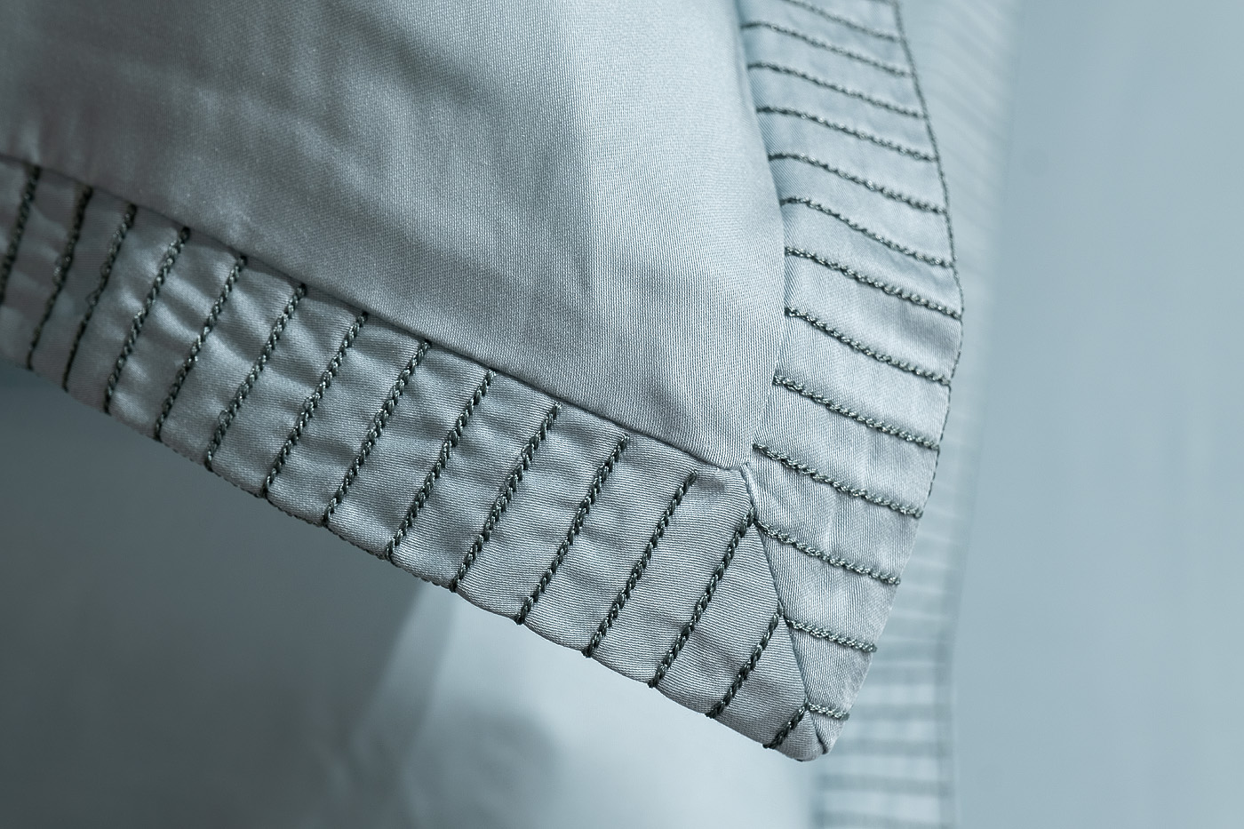 Комплект наволочек с клапаном сшит из 100% ткани тенсель. По периметру наволочки уникальная вышивка в цвет ткани, формирующая бордюр шириной 3 см.