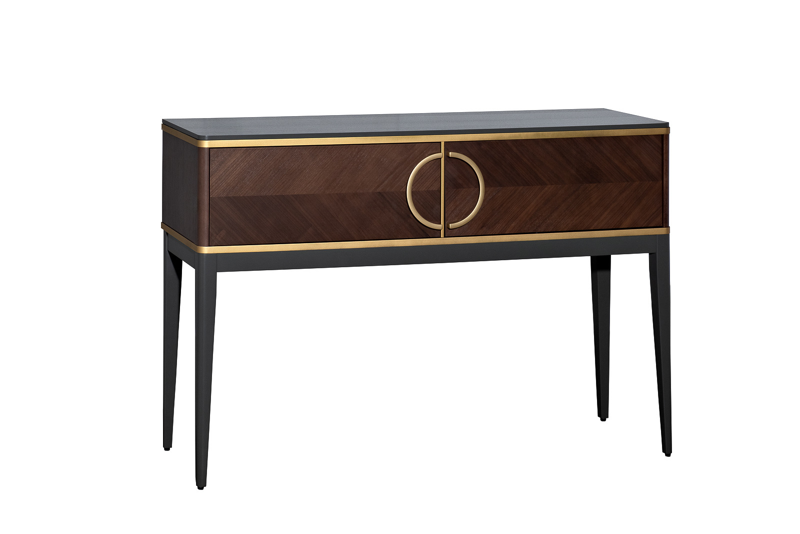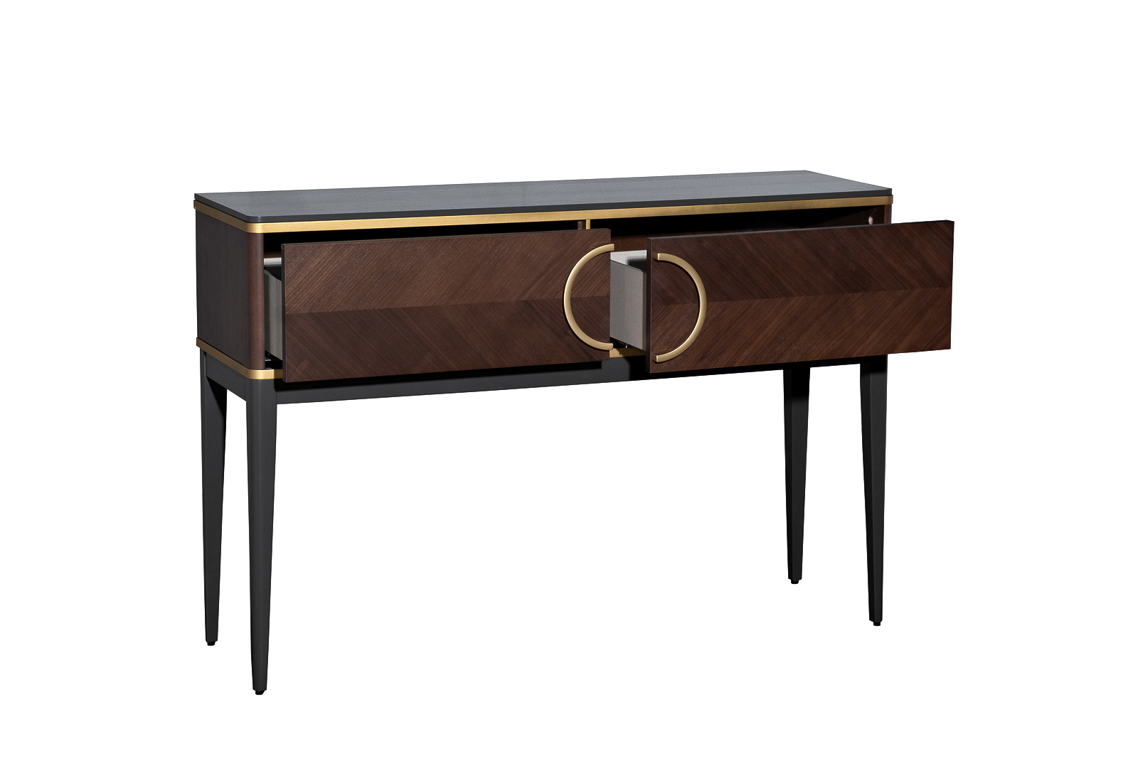 Элегантная консоль в отделке тёмным шпоном воплощает современное прочтение премиальной классики. Геометрия фасадов с выразительным рисунком древесины подчеркнута тонкими акцентами и эффектной кольцевой ручкой, формирующей узнаваемый характер модели. Лёгкие вытянутые опоры визуально приподнимают силуэт, добавляя композиции изящества и архитектурной чёткости. Функциональная консоль с ящиками позволяет аккуратно разместить необходимые мелочи в прихожей, гостиной или спальне. Консоль с 2-я ящиками из коллекции "ШПОН". Коллекция "ШПОН" является авторской разработкой студии Garda Studio, в стиле ар-деко.Габариты консоли:ширина-120см, глубина-35см, высота-80см. Фасады коллекции "ШПОН" облицованы шпоном под цвет "Американский орех", украшены объемными полукруглыми ручками цвета "матовое золото"(ручки-металл) и декоративными элементами из массива бука под цвет "матовое золото". В состав коллекции так же входит: тумба под TV-арт.151SV-10003; тумба прикроватная-арт.151SV-10001
