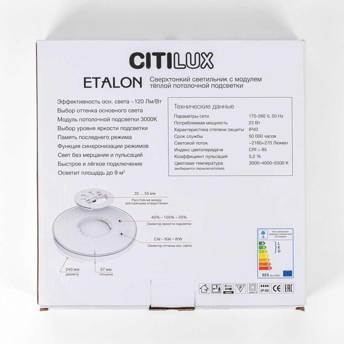 Изделие обладает высокой энергоэффективностью основного света – 120Лм/Вт, осветит до 9м². Мощность: основной свет - 18Вт, потолочная подсветка – 4,5Вт. Диаметр 24см, высота 3,5см. Тип крепления – удобная монтажная платформа. Исключительно лёгкий монтаж!