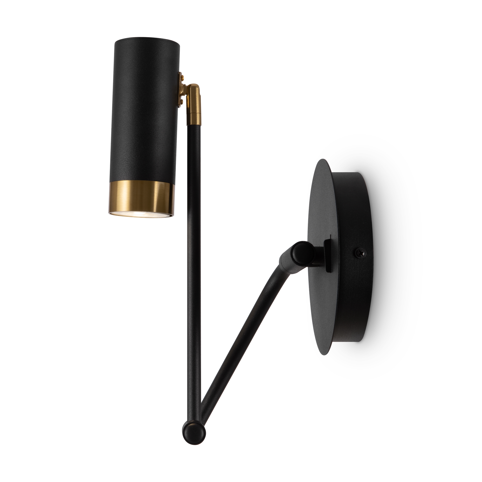 Арматура и плафоны из металла. Черный цвет дополнен латунной окантовкой. Поворотные плафоны и арматура позволяют видоизменять композицию и регулировать направление светового потока. Источник света – лампа GU10.