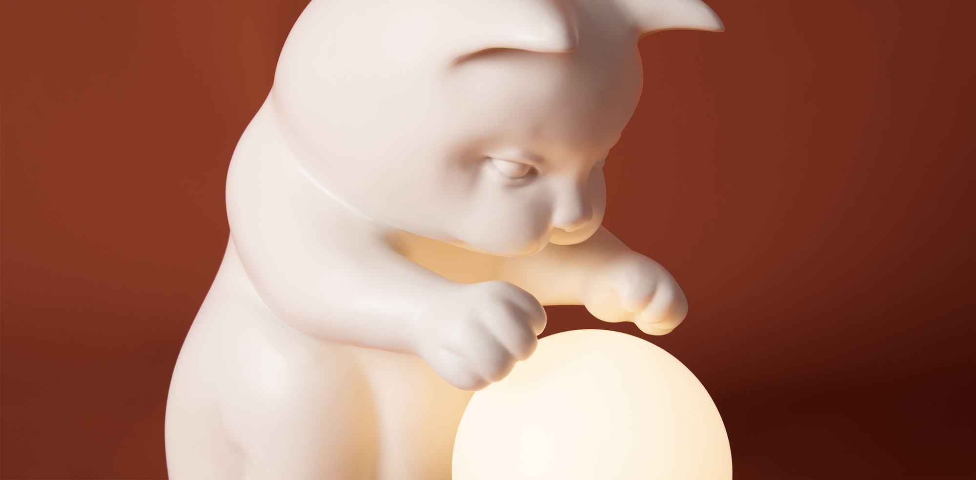 Арматура — полирезин. Абажур из белого матового пластика, форма сферы. Интегрированный LED источник света 3000К. Высота 270 миллиметров. Сенсорное управление. Фигурка котика (RAL 9001) в комплекте.