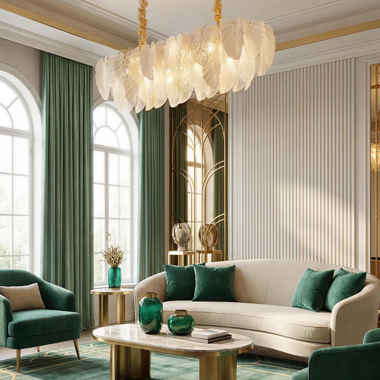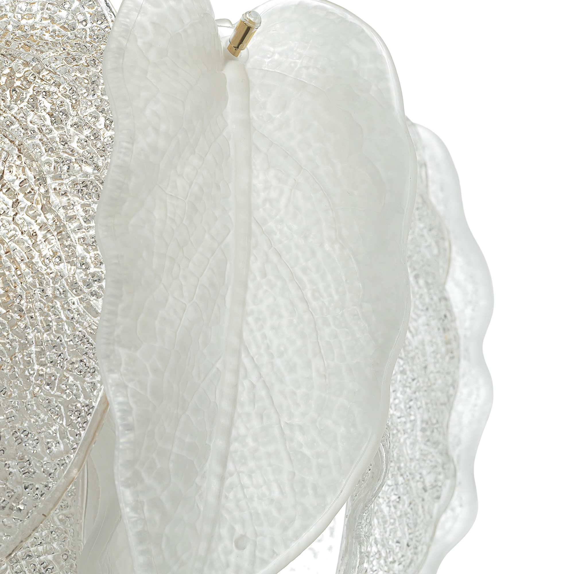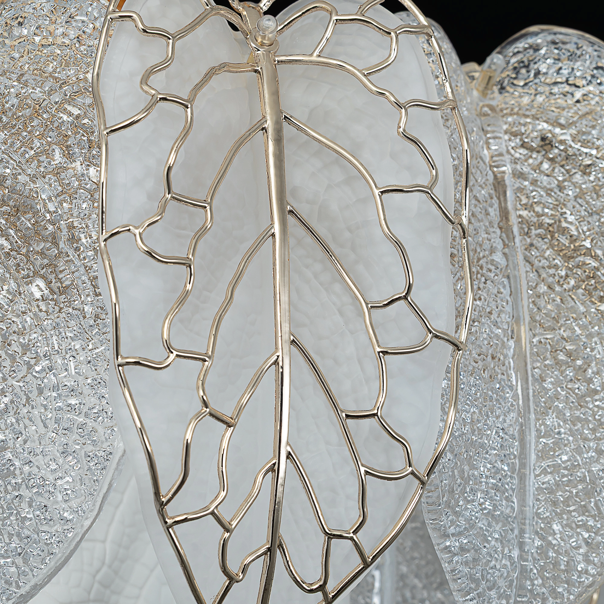 Металлический каркас золотистого оттенка переливается в лучах света. Листья из полуматового и прозрачного рифленого стекла, белой керамики, а также металлические листья с прожилками, отлитые по ювелирной технологии, подчеркивают флористическую изысканность и четкость силуэта люстры. В изделии используются 16 лампочек с цоколем Е14, высоту подвесных цепей можно отрегулировать.