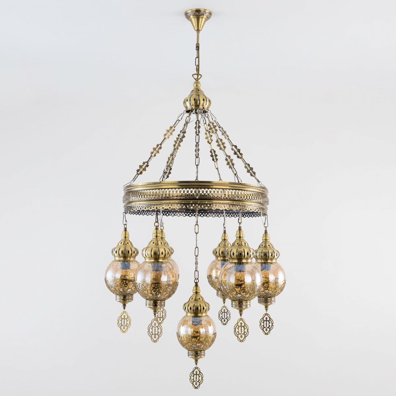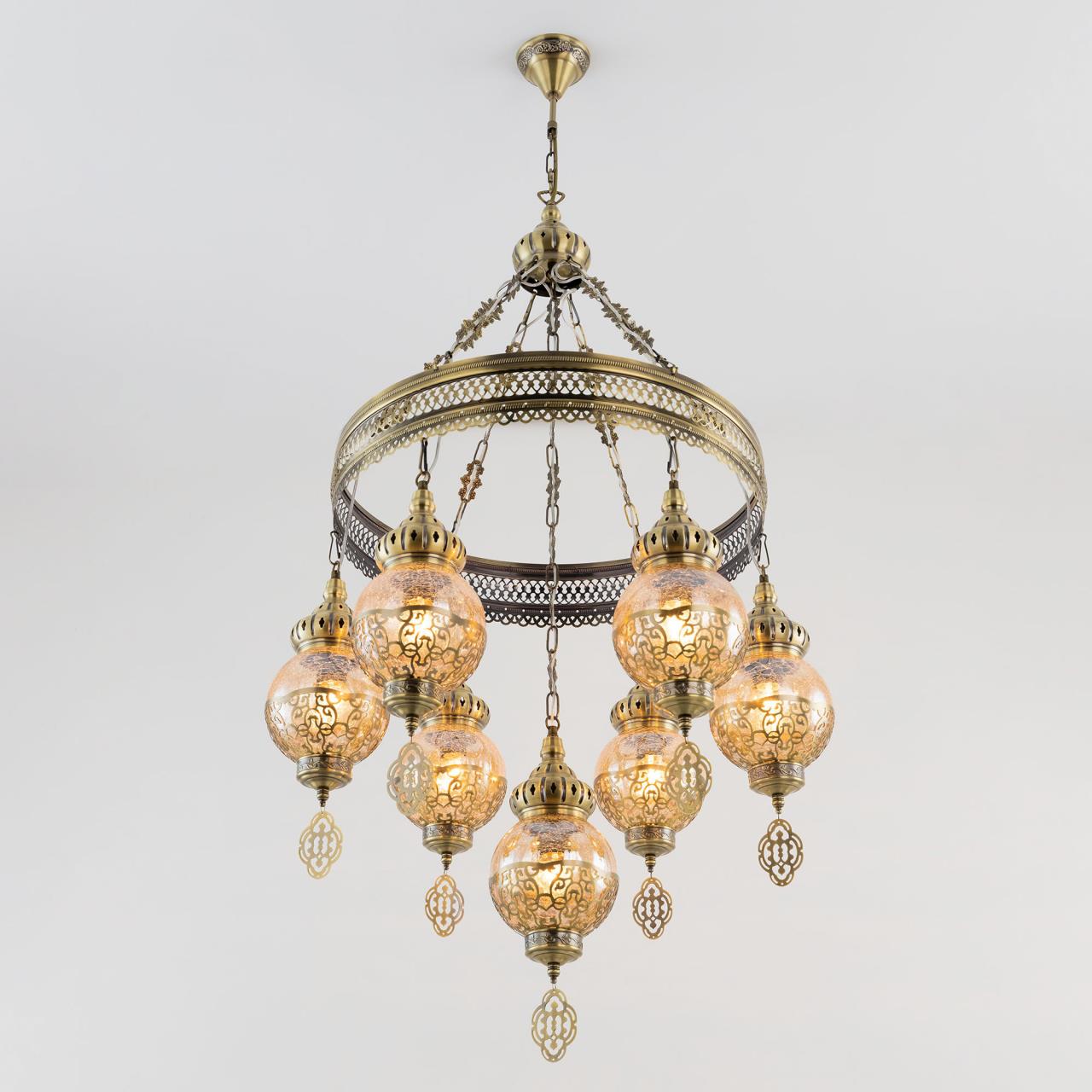 Восточная каскадная люстра CL419163 , страна бренда Дания , производитель Citilux , модель CL419163 относится к коллекции Каир с семью подвесными плафонами. Каркас металлический, цвет бронза. Плафоны в форме шара, изготовлены из прозрачного стекла медового оттенка, украшены декоративными, ажурными элементами. В изделии используются лампы с цоколем Е27, максимальной мощностью для ламп накаливания 75Вт. Светодиодные лампы можно устанавливать более яркие. Модель подходит для всех типов потолков, в том числе натяжных. Тип крепления – крючок. Люстра Каир CL419163 прекрасный вариант для атмосферного освещения интерьеров квартир и загородных домов, выполненных в восточном стиле. Это великолепное решение при оформления уютных кафе, баров и ресторанов. Купить модель CL419163 спешите в интернет магазине 220svet.ru