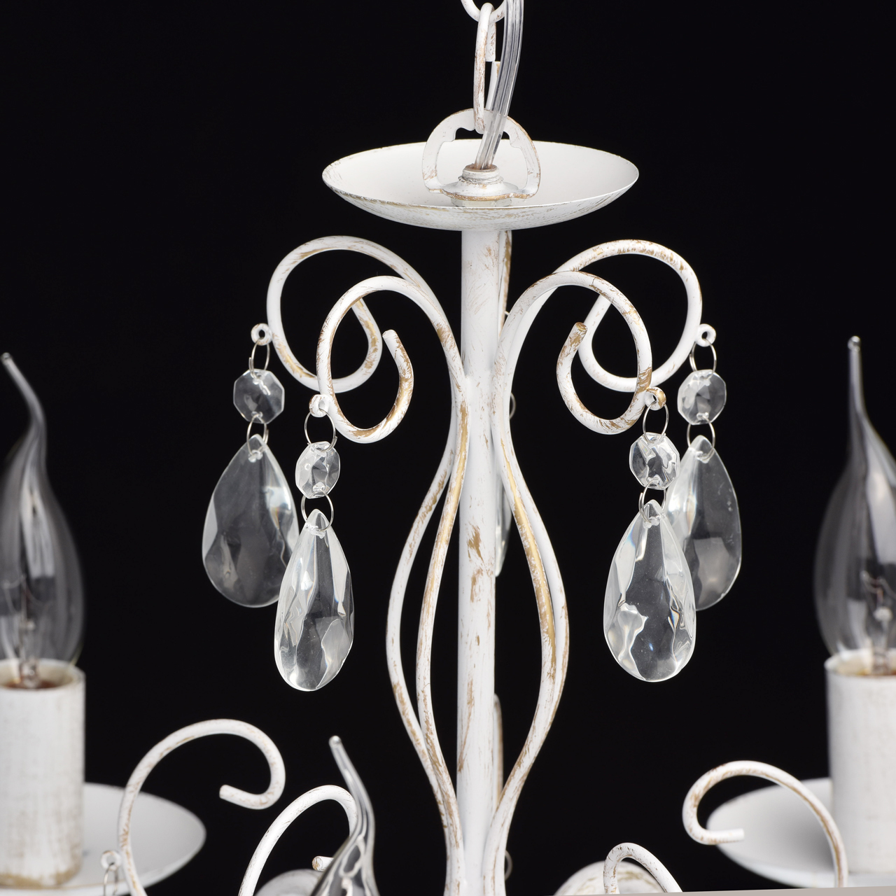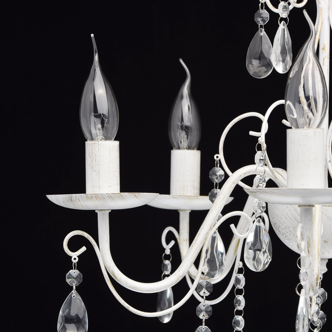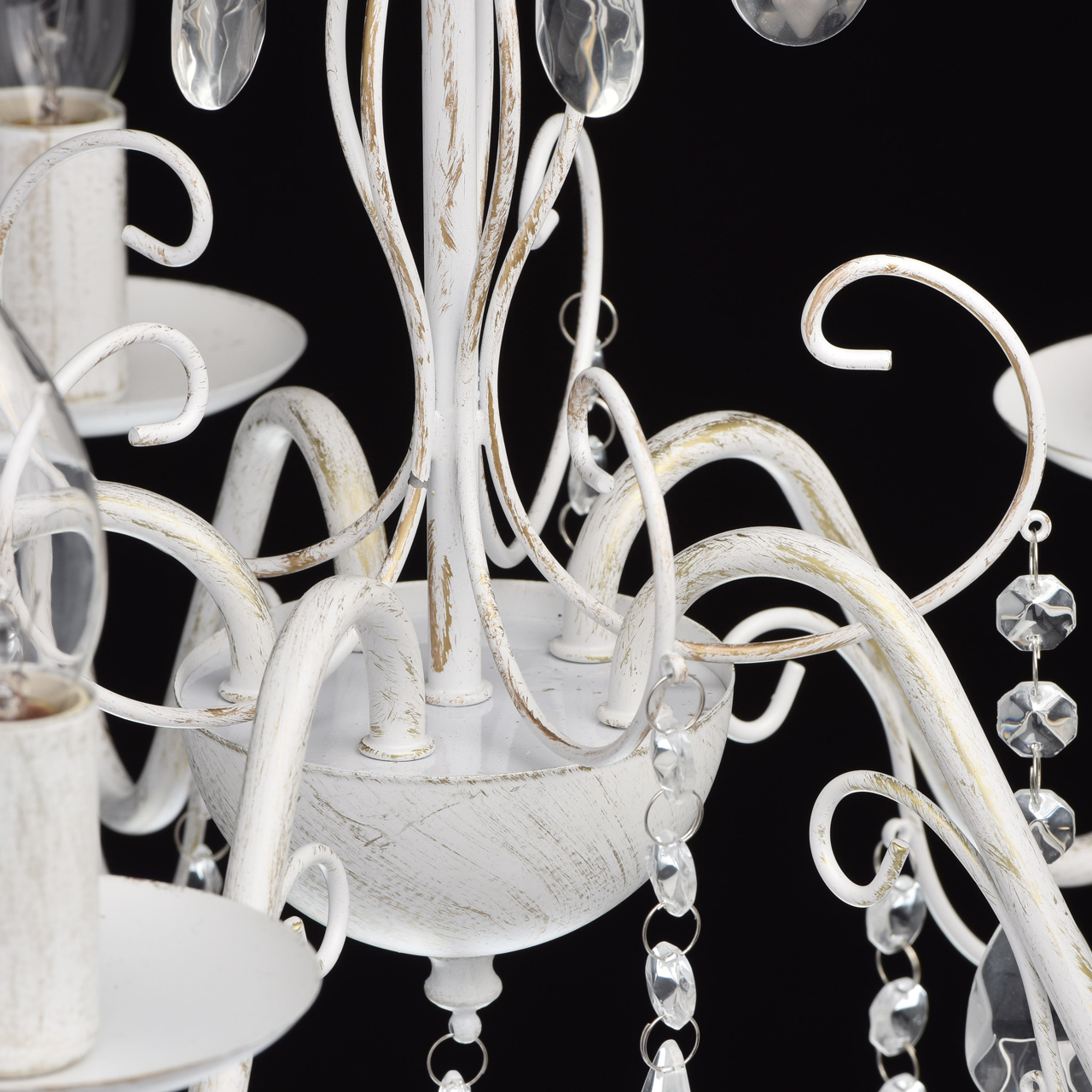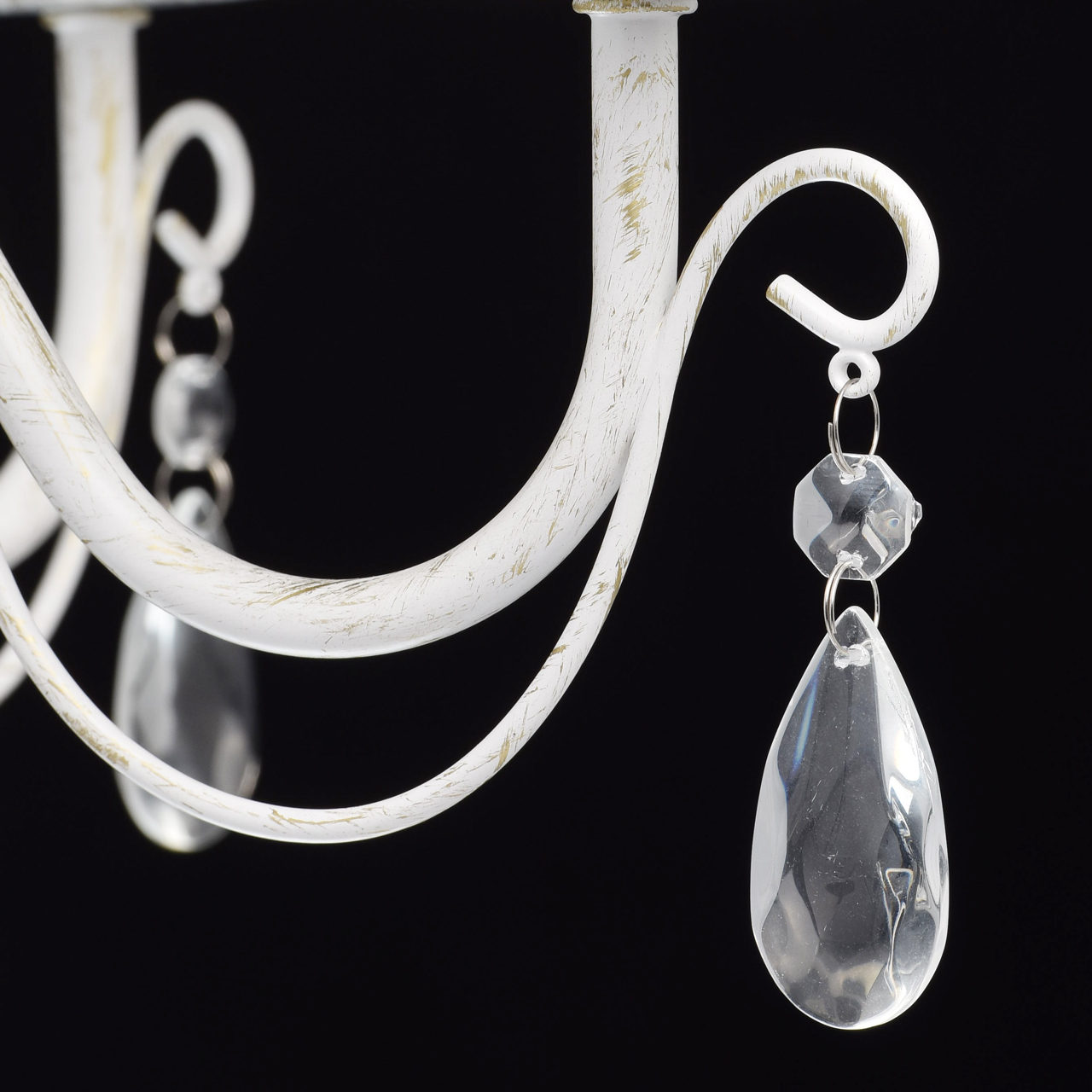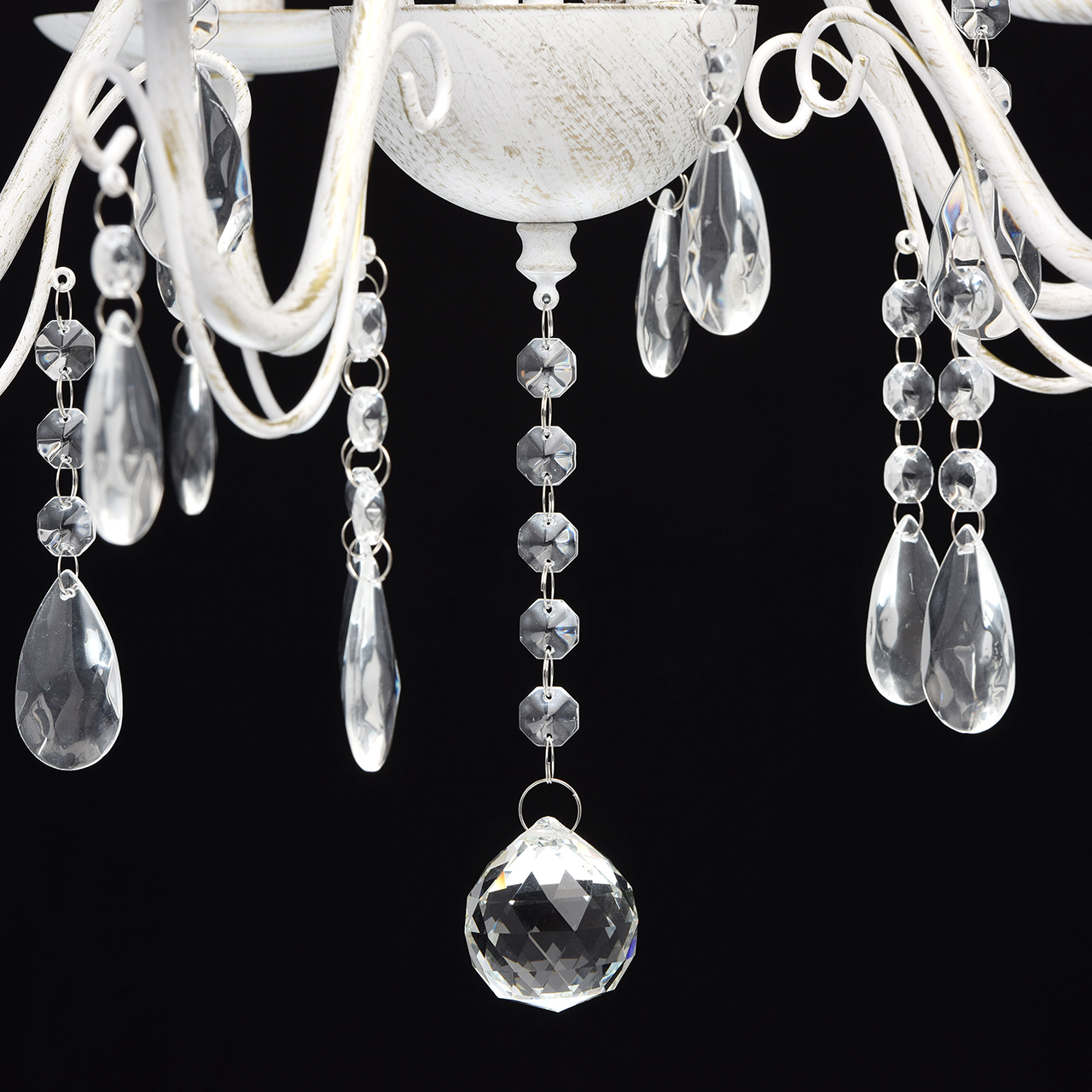 Основание светильника выполнена из металла и окрашена по технологии хай-лайт, основный слой - белый, декоративный слой - золотого цвета. Декор: подвески из декоративного стекла.