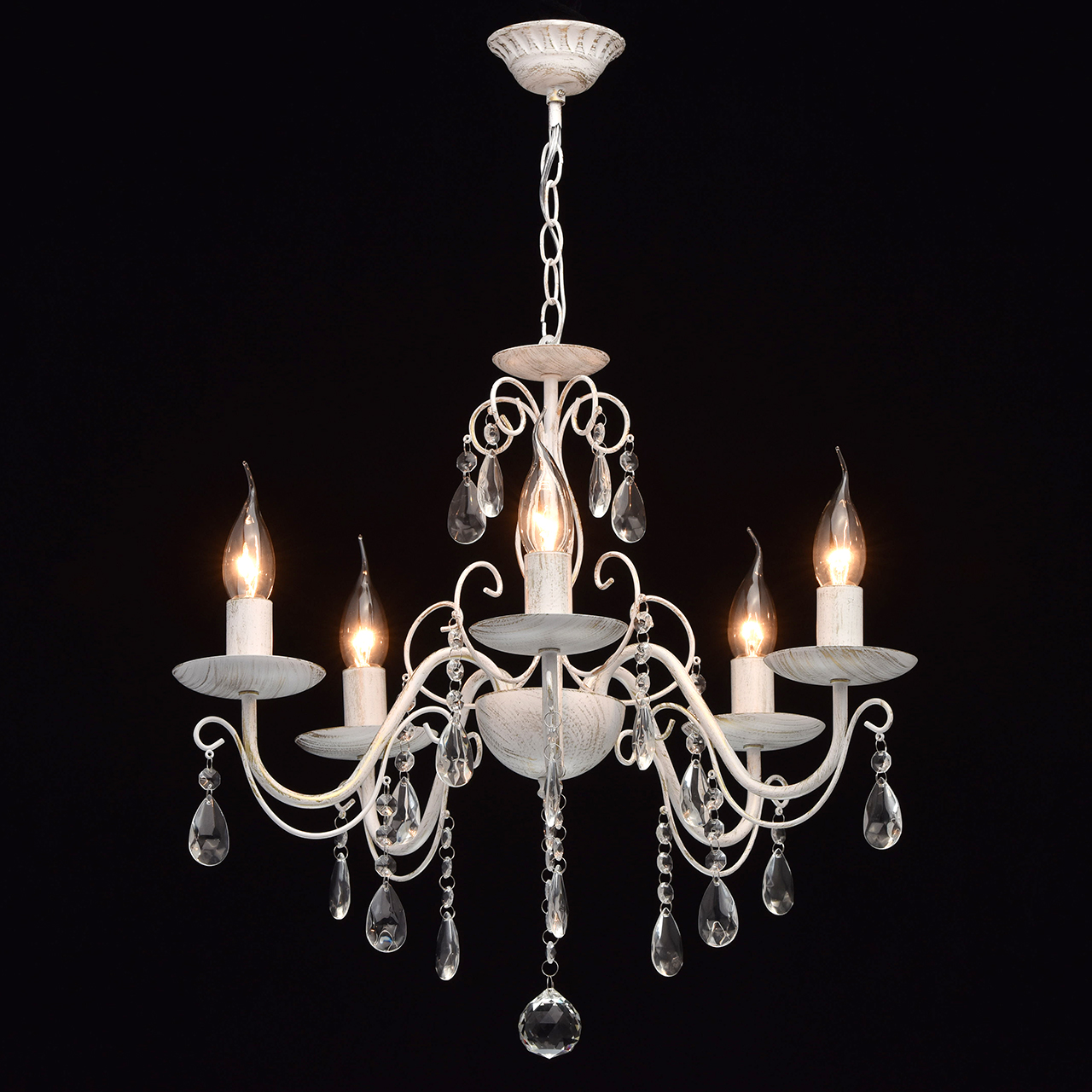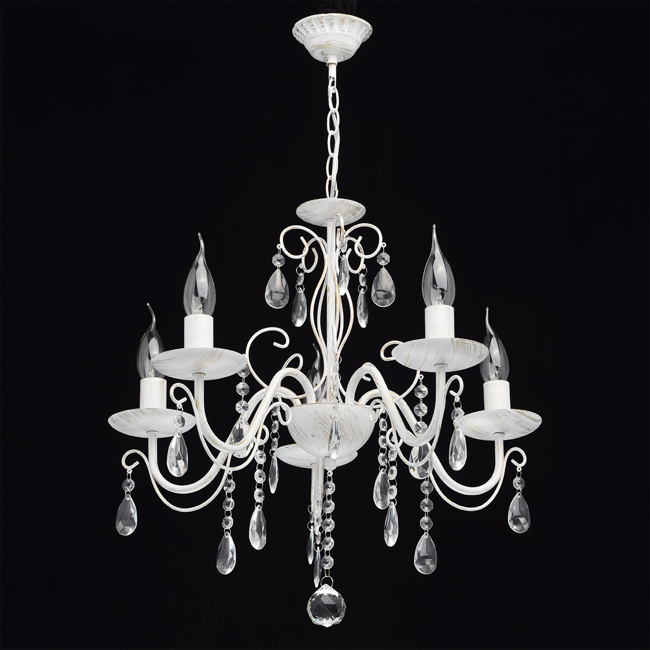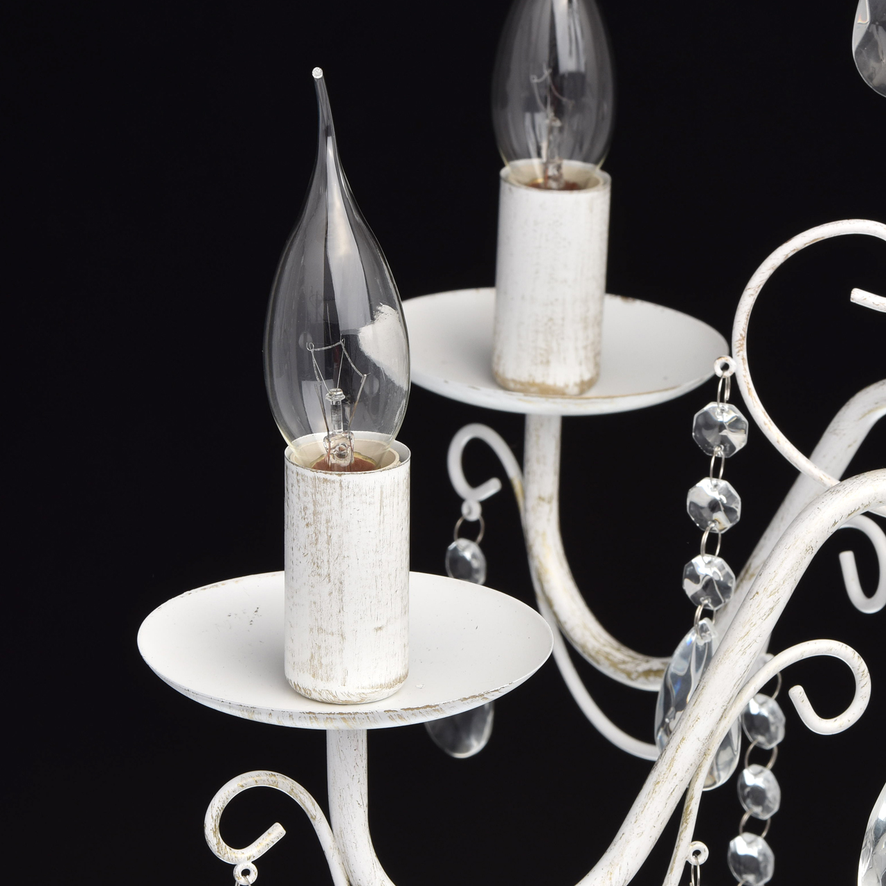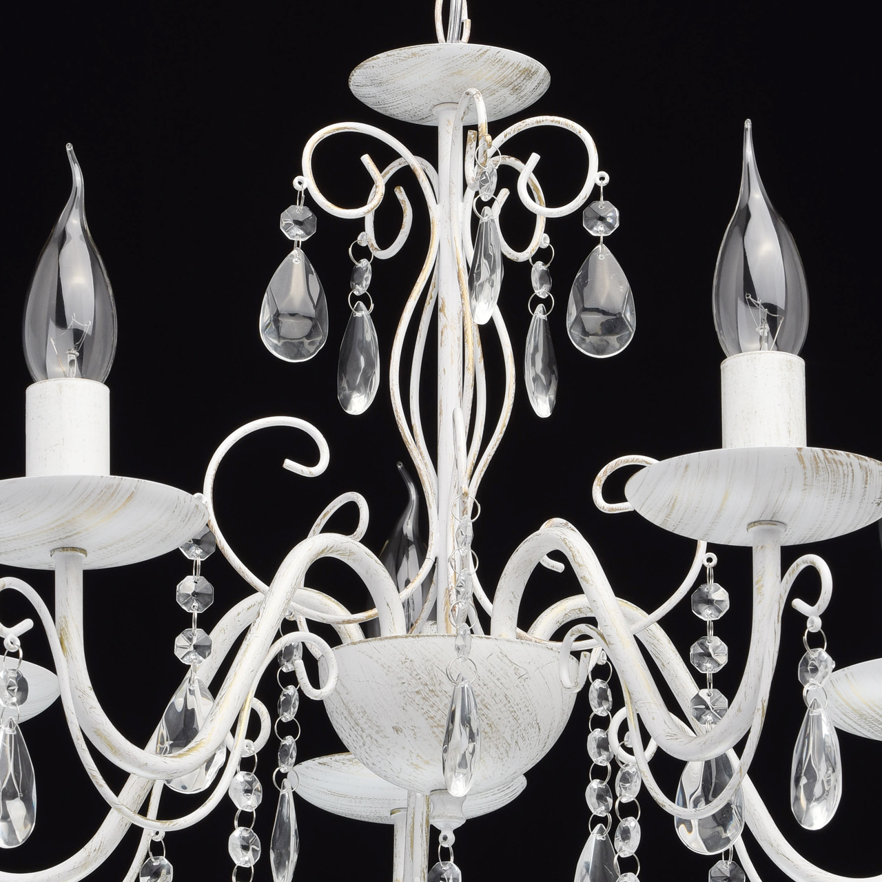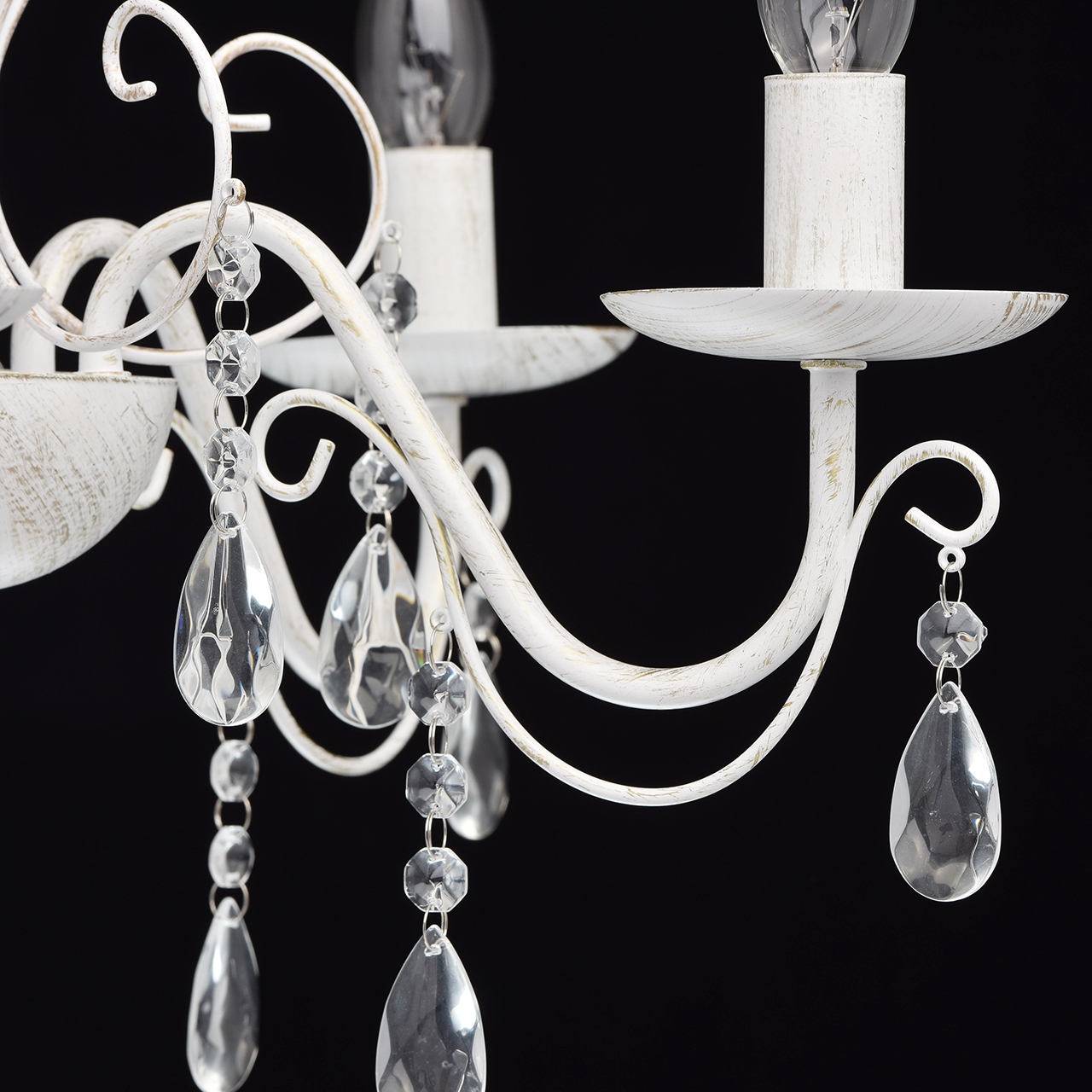Основание светильника выполнена из металла и окрашена по технологии хай-лайт, основный слой - белый, декоративный слой - золотого цвета. Декор: подвески из декоративного стекла.