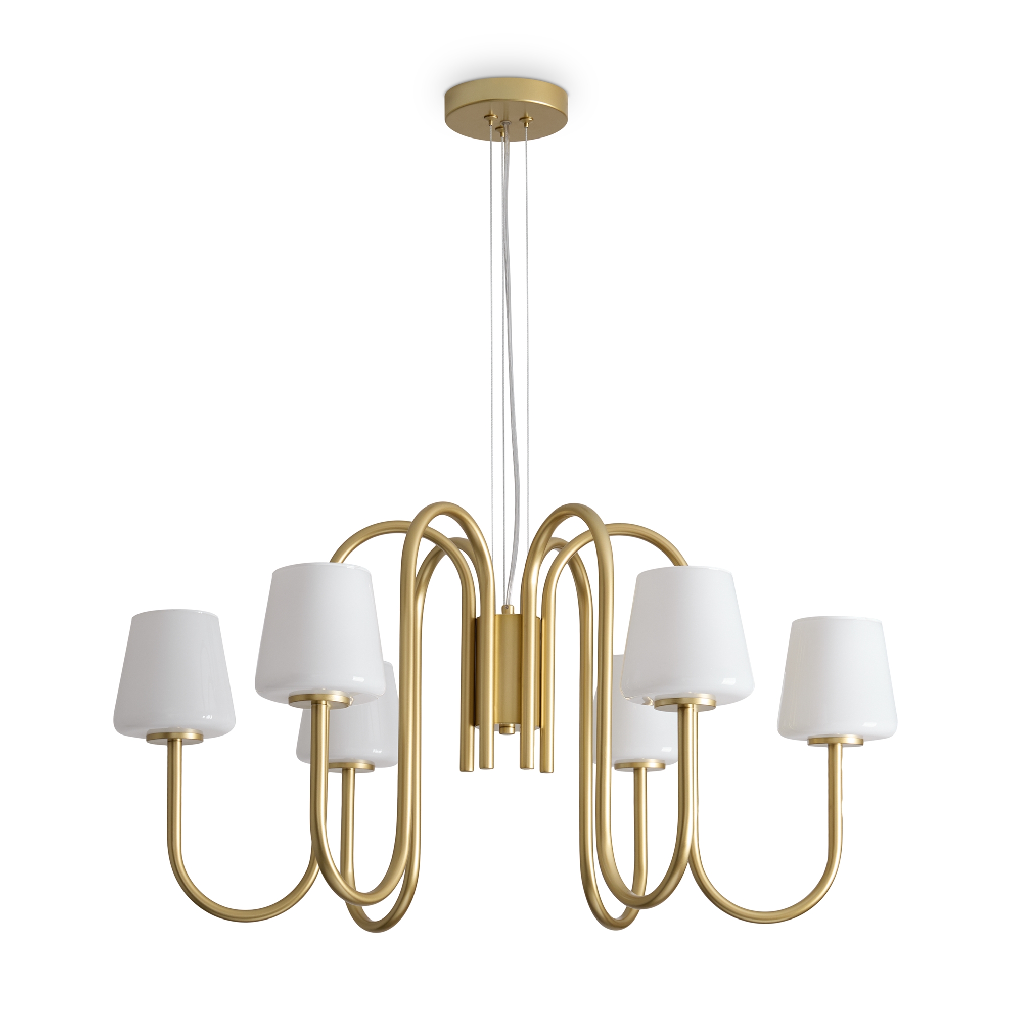 Материал арматуры — металл, цвет — матовое золото. Подвесной и настенный светильники с цоколем E14. Плафоны выполнены из белого глянцевого стекла, которые мягко рассеивают свет. Минималистичная классика подходит для современных и традиционных интерьеров. Данную модель FR2039PL-06G с быстрой доставкой спешите купить в магазине 220svet.ru