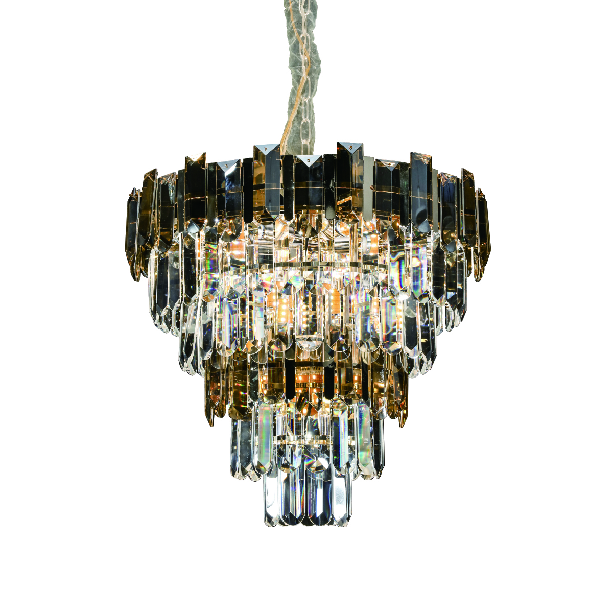 Каскадная люстра Delight Collection 1710-600 gold с прозрачными и дымчатыми элементами, расположенными в несколько ярусов. Основание люстры из металла золотого цвета.