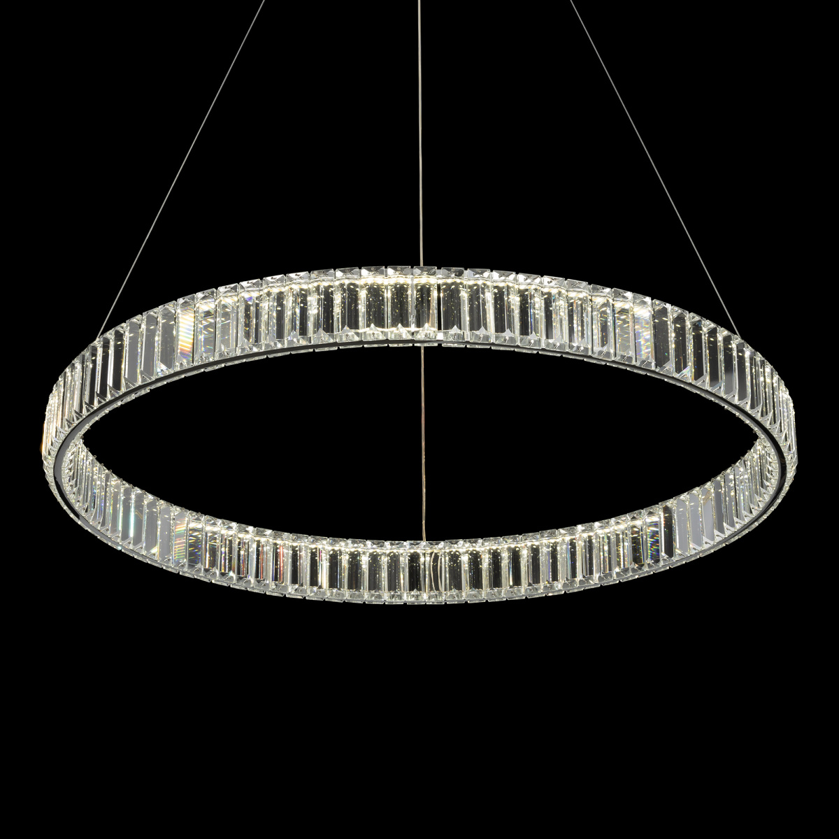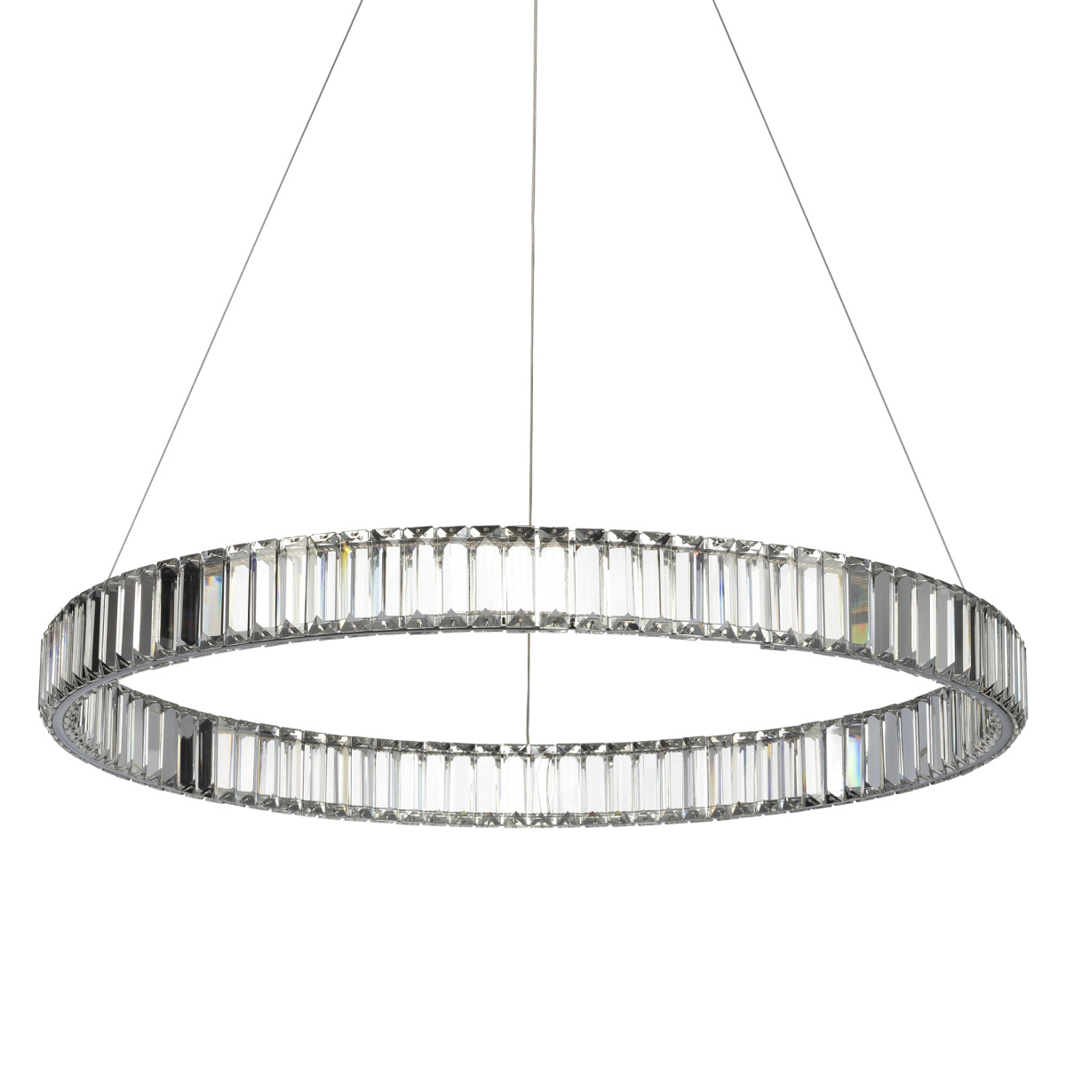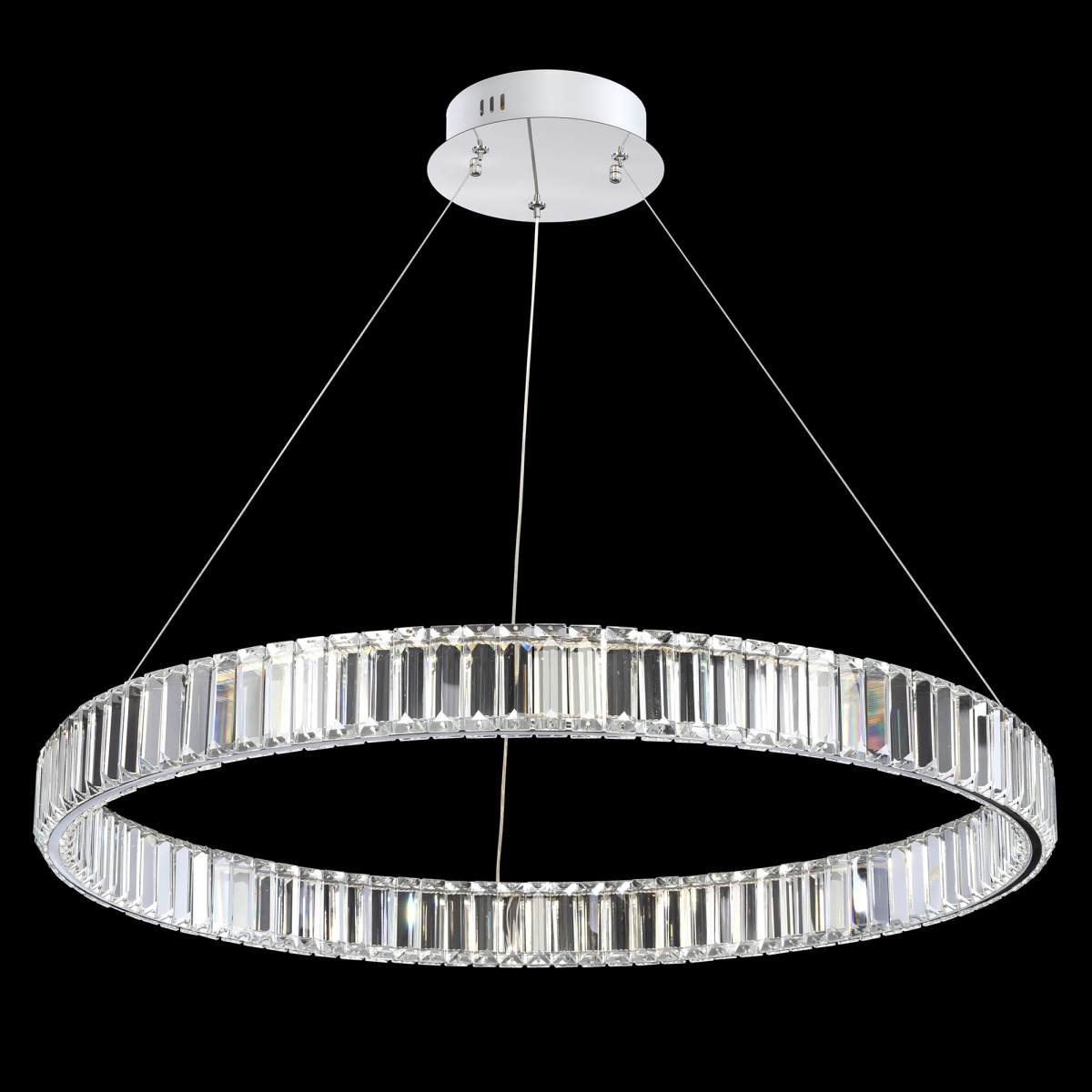 Хрустальная светодиодная люстра CL338181 от производителя Citilux серия Чезаре истинное произведение искусства, которое не оставит равнодушными даже самых требовательных ценителей красоты. Основание круглой формы, цвет хром. Хрустальное кольцо на металлическом каркасе, подвешено на элегантных тросиках и словно парит в воздухе. Хрустальные элементы являются воплощением кристальной прозрачности и современной огранки, они играют сияющими отблесками света и создают неповторимую атмосферу роскоши и элегантности. Высота подвесной модели легко регулируется в диапазоне от 40см до 1,5м, что делает ее идеальным решением для помещений с высокими, стандартными и низкими потолками. Диаметр кольца 800мм. Мощность изделия 70Вт, что позволяет ей осветить площадь до 23м², создавая при этом яркое и равномерное освещение. Особенностью светильника является возможность управления с помощью пульта дистанционного управления - можно регулировать яркость света от 10% до 100%, выбирать цветовую температуру в диапазоне от 3000 до 5500 К и наслаждаться теплыми, нейтральными или холодными оттенками света, есть режимы памяти и ночника. Всё это делает использование люстры Чезаре еще более комфортным и удобным , страна бренда Дания.Купить модель CL338181 спешите в интернет-магазине 220svet.
