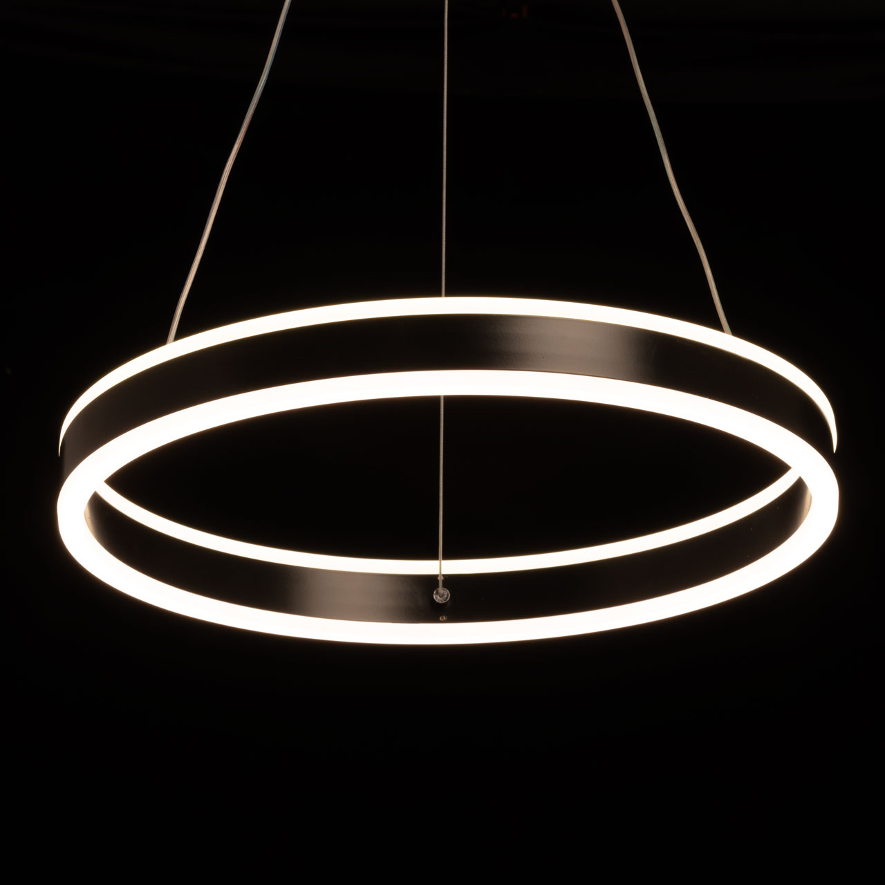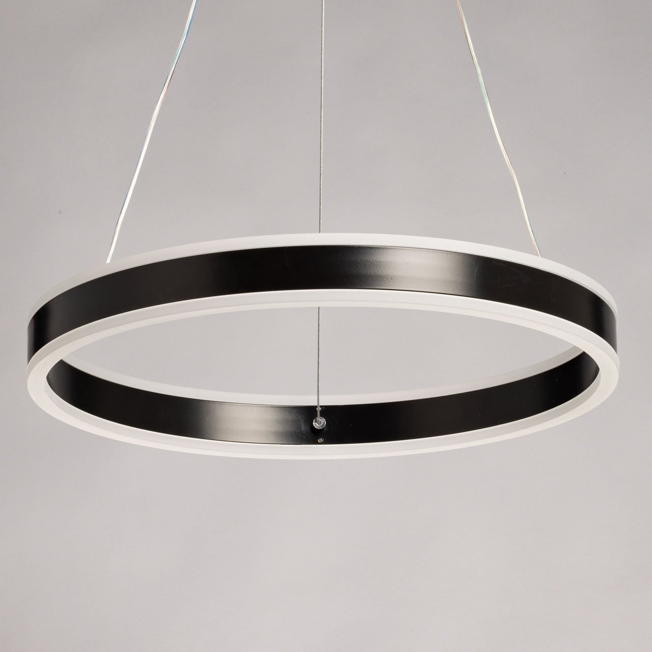 Металлическое основание подвесной люстры окрашено в черный цвет. Плафон люстры выполнен из сплава алюминия с цинком и окрашен в цвет основания. Светодиодные источники света закрыты белым матовым акрилом.