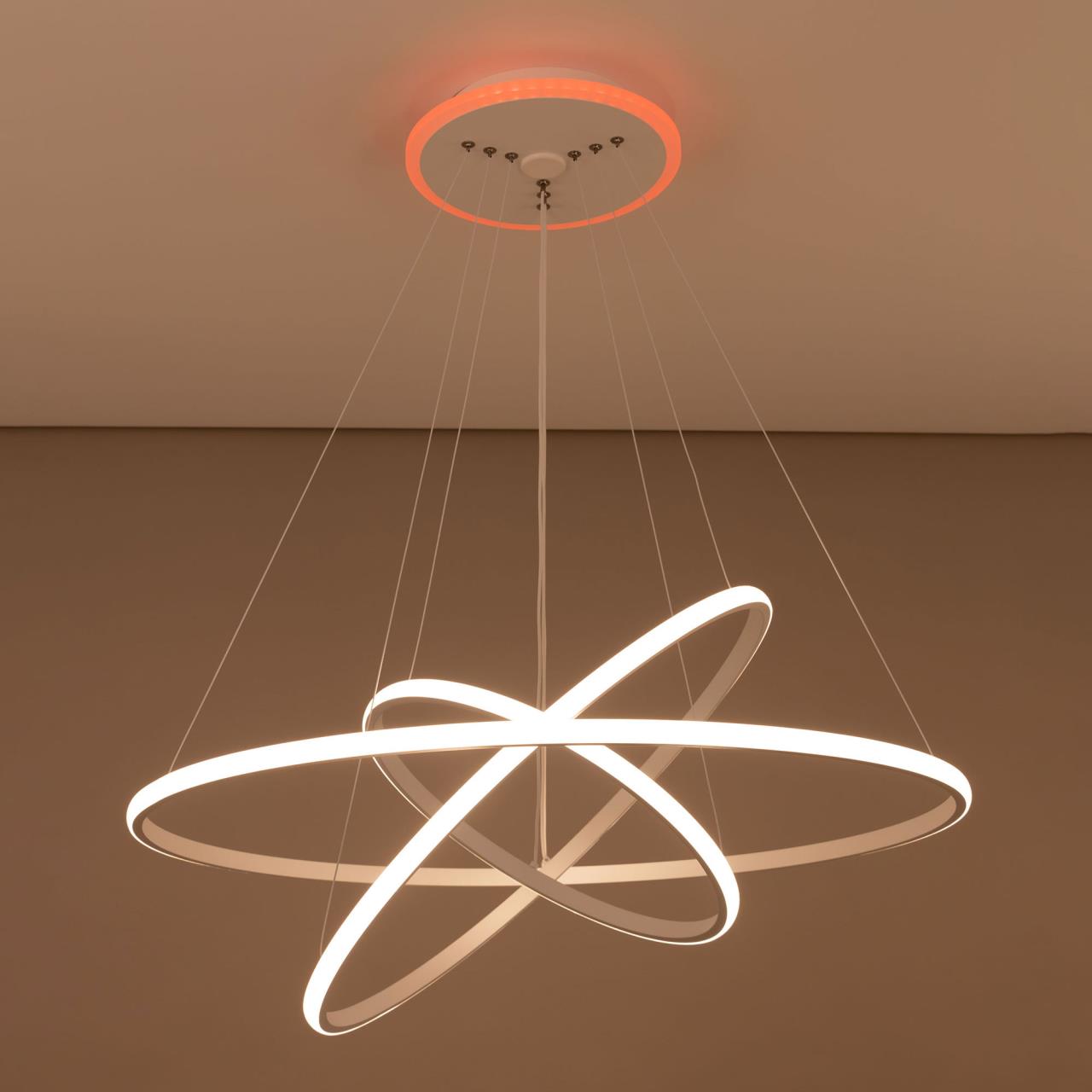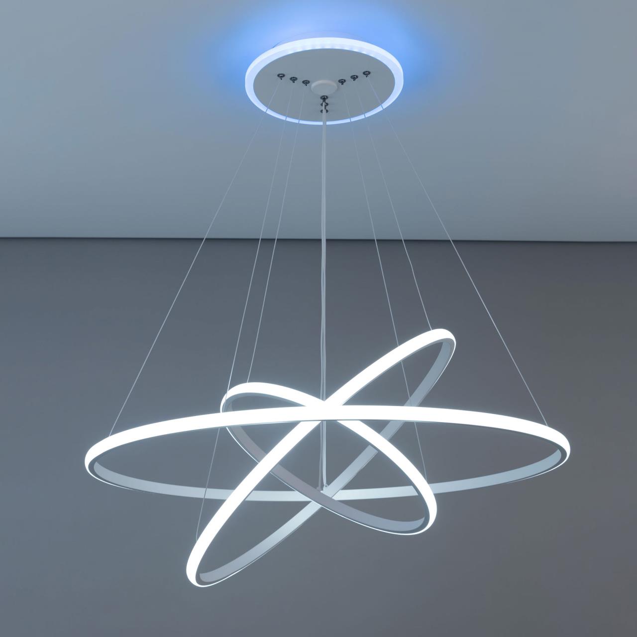 Подвесная светодиодная люстра CL731A090E от производителя Citilux относится к коллекции Неон Смарт с голосовым управлением, входит в экосистему Citilux SMART. Светильником можно управлять: из приложения на смартфоне по Wi-Fi, при наличии интернета, с помощью голосовых помощников Алиса и Маруся, а также пультом дистанционного управления и настенным выключателем. Люстра на тросах, в форме каскада из трех подвесных колец, высоту и угол наклона каждого из которых можно изменить. Корпус изготовлен из алюминиевого сплава, окрашенного в белый цвет. Рассеиватель оптический полимер, цвет белый матовый. Крепление люстры подходит для всех типов потолков, в том числе натяжных. Тип крепления – планка. Модель оснащена мощными светодиодами, с возможностью плавной регулировки яркости от 10 до 100%. Цветовая температура регулируется в диапазоне от 3000К до 5500К, с возможностью настроить любые оттенки теплого, нейтрального и холодного света. В основании светильника установлена независимая цветная подсветка RGB. Мощность изделия 110Вт, световой поток 6800Лм, площадь освещения до 21м² . страна бренда Дания.Купить модель CL731A090E спешите в интернет-магазине 220svet.