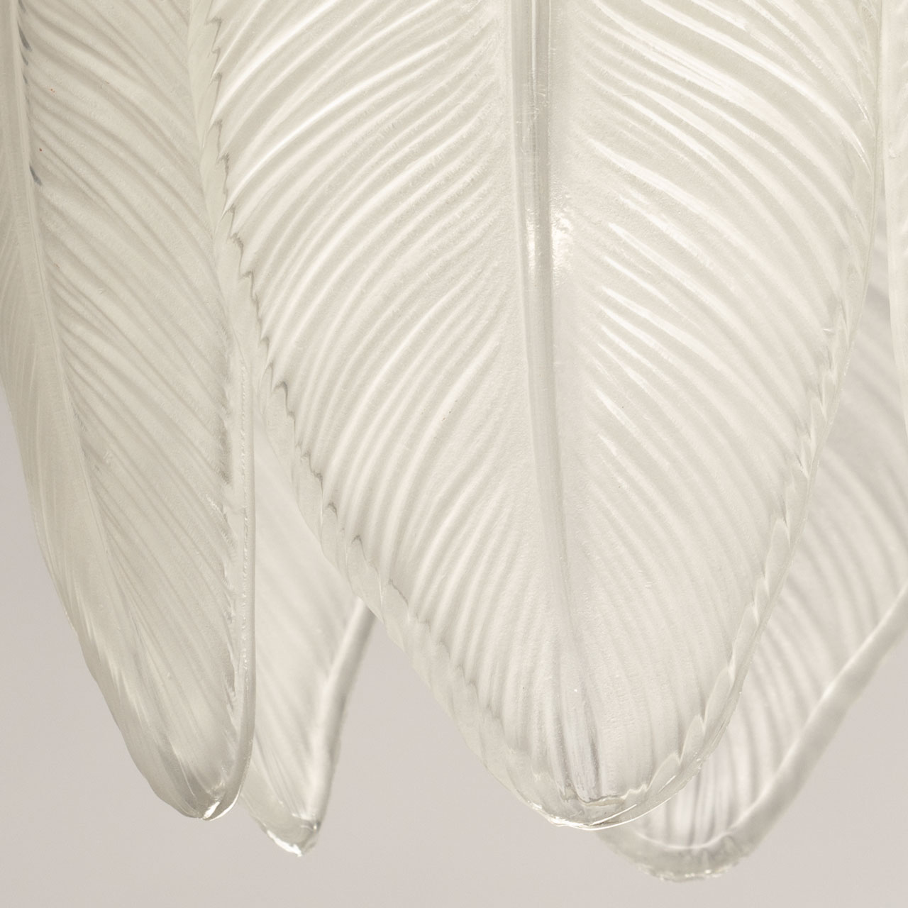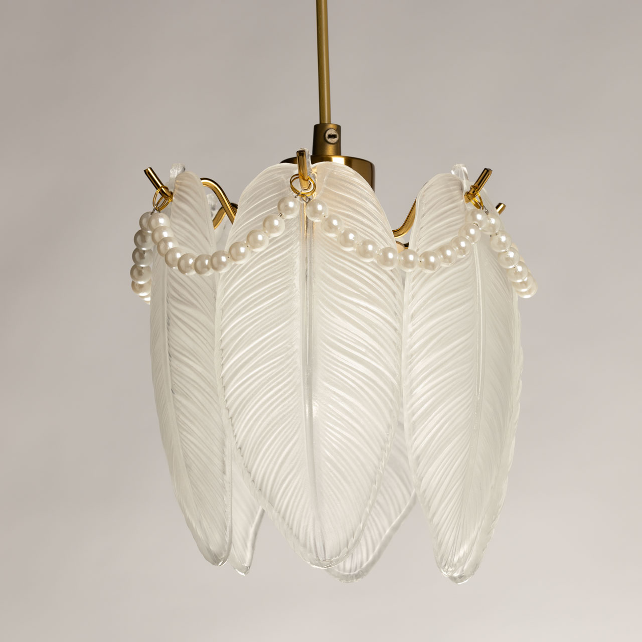 Металлическое основание подвесной люстры гальванизировано в цвет золота. Люстра декорирована матированными стеклянными элементами в форме листьев, а также бусами с имитацией жемчуга.