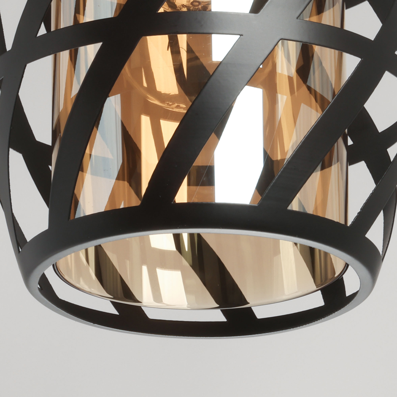 Потолочная чаша и держатель плафона выполнены из металла и гальванизированы в цвет золота. Металлический плфон окрашен в черный цвет. Внутренний стеклянный плафон гальванизирован в цвет шампань.