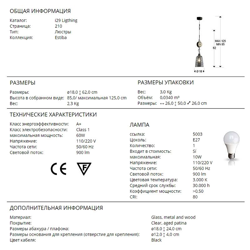 Мощность связана с величиной светового потока люмен (Lm), и от неё зависит яркостью лампы. - Общая мощность: 60 W