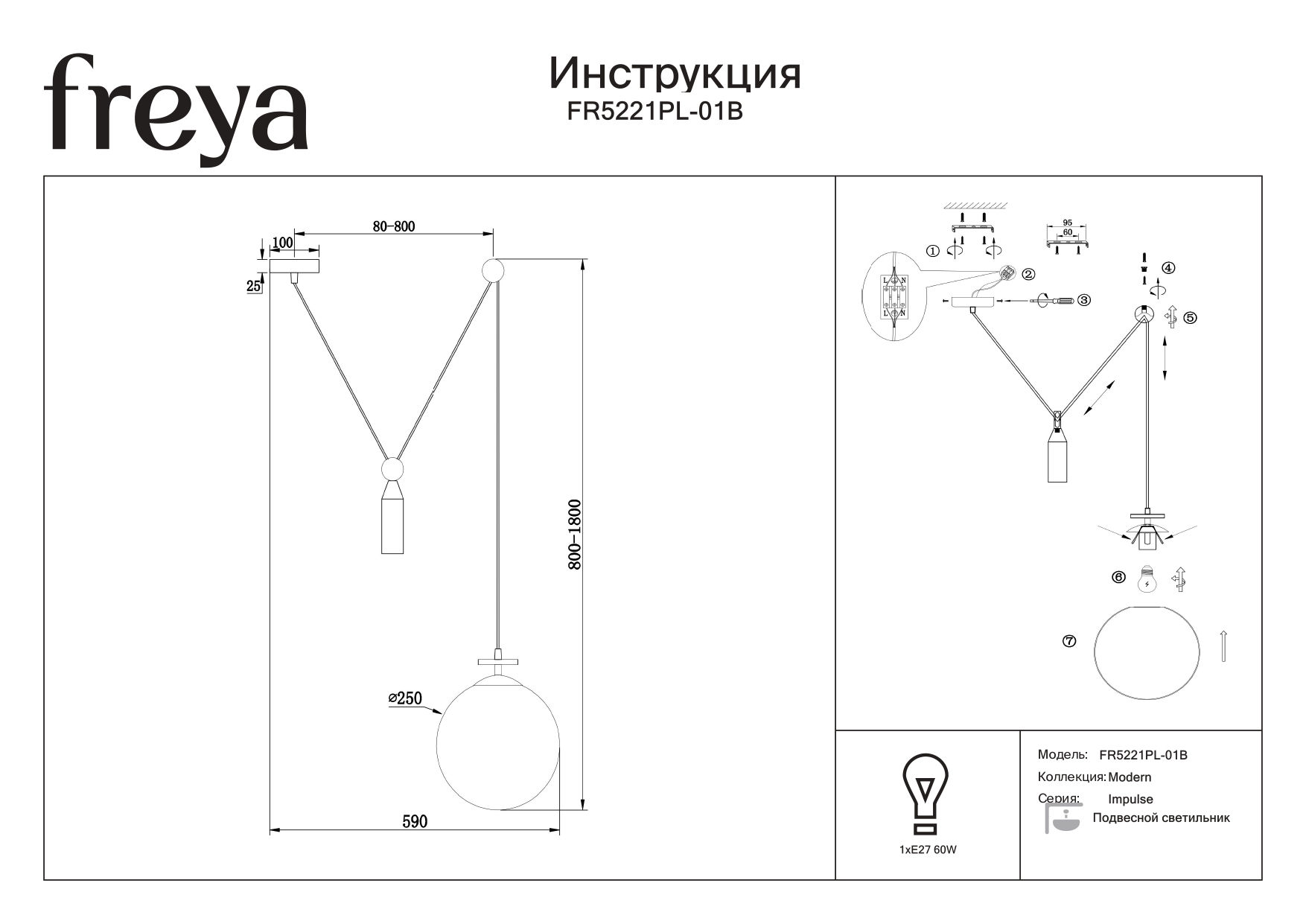 Чаша крепления и элементы корпуса выполнены из металла, цвета – черный и золотой. Плафон-сфера из белого матового стекла. Специальный грузик-противовес позволяет реглуировать высоту светильника. Универсальный дизайн для пространств любых габаритов. Источник света внутри плафона – лампа с цоколем Е27.