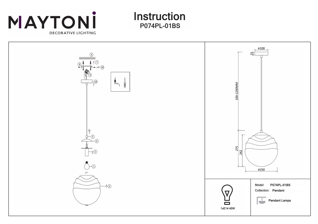 Подвесной светильник Maytoni Vinare P074PL-01BS — это надёжный и долговечный осветительный прибор, который станет прекрасным дополнением вашего дома и будет радовать вас своим стильным дизайном и функциональностью на протяжении многих лет.