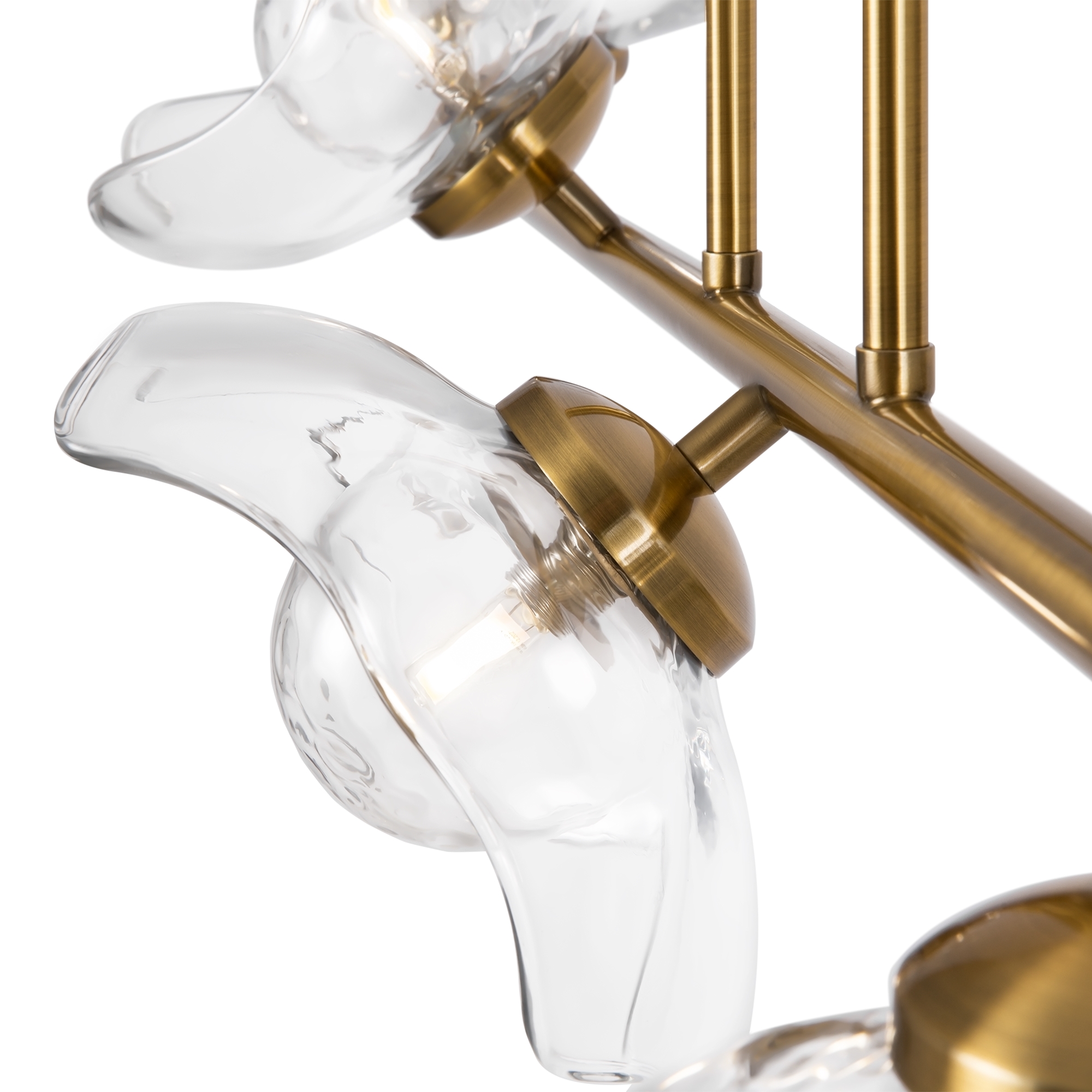 Арматура - металл, цвет - латунь. Плафоны-соцветия из литого стекла в плавных формах. Эффектные световые блики на плавных рельефах плафона. Источник света - лампа с цоколем G9.