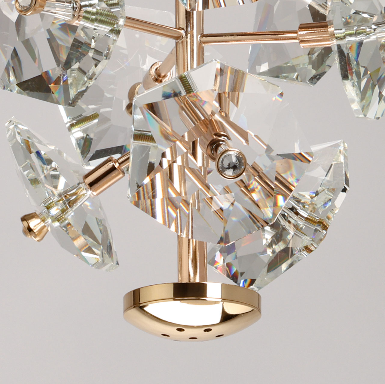 Металлическое основание подвеса гальванизировано в цвет золота. Подвес декорирован прозрачными хрустальными элементами.