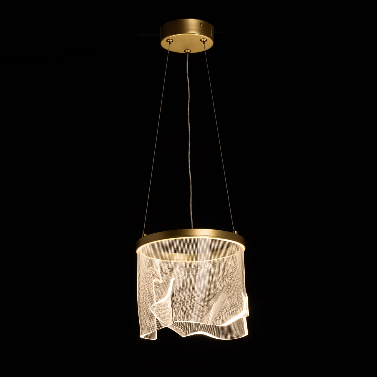 Благородный цвет латуни эффектно сочетается с минималистичным дизайном подвесной люстры. Материал корпуса плафона эффективно отводит тепло от светодиодов, продлевая их срок службы. Оригинальный плафон волнистой формы из прозрачного акрила с точечным рисунком обеспечивает приятное и равномерное освещение. Многорежимность освещения от 3000К до 6500К позволяет подобрать комфортную температуру света через настенный выключатель. Качественные светодиоды экономичны и безопасны. Возможность регулировать комфортную высоту.