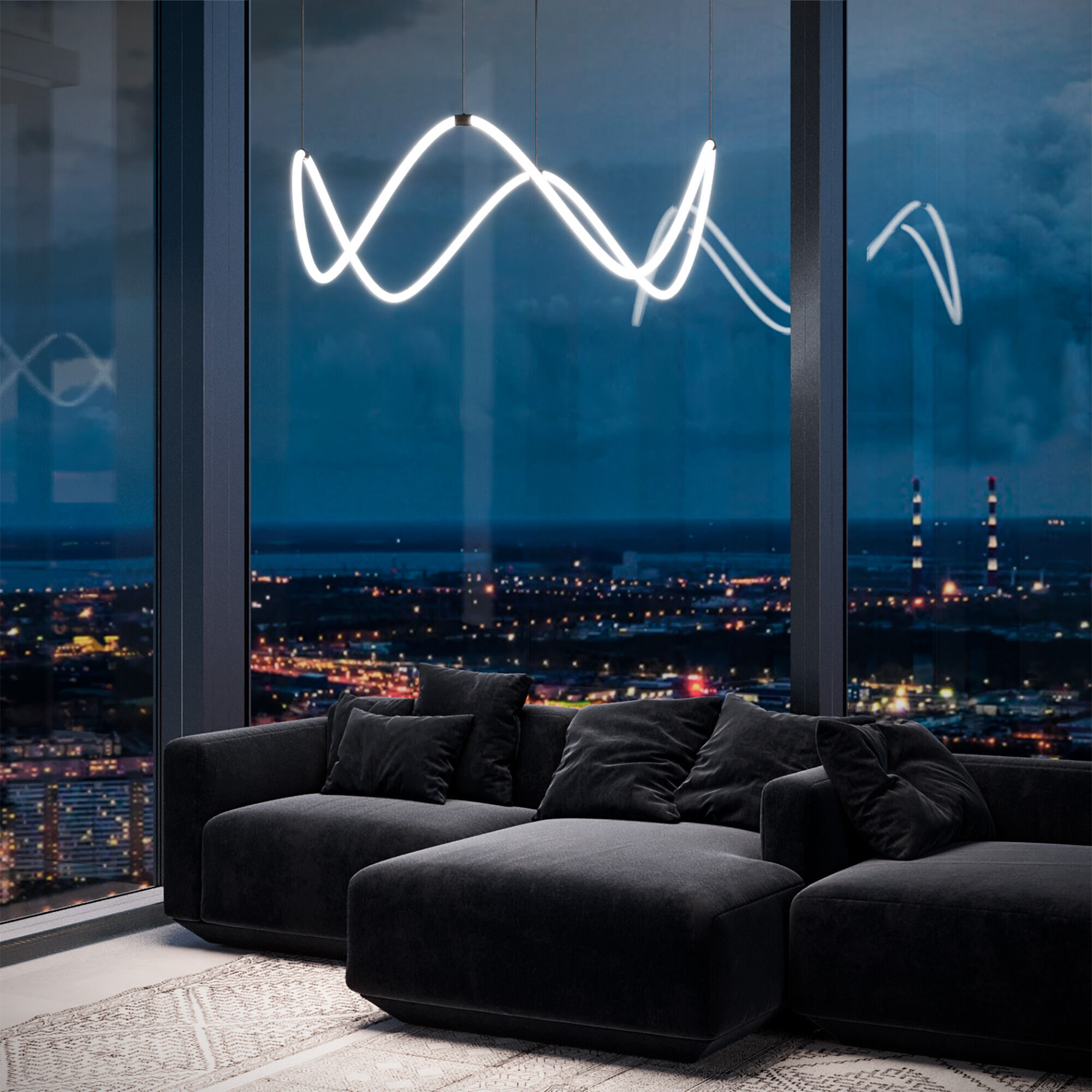 Необычная люстра из гибкого неона Full Light с пультом управления способна в корне изменить привычное восприятие интерьера гостиной, спальни, кухни или кабинета. Благодаря гибкости неон можно расположить совершенно в разных вариациях.