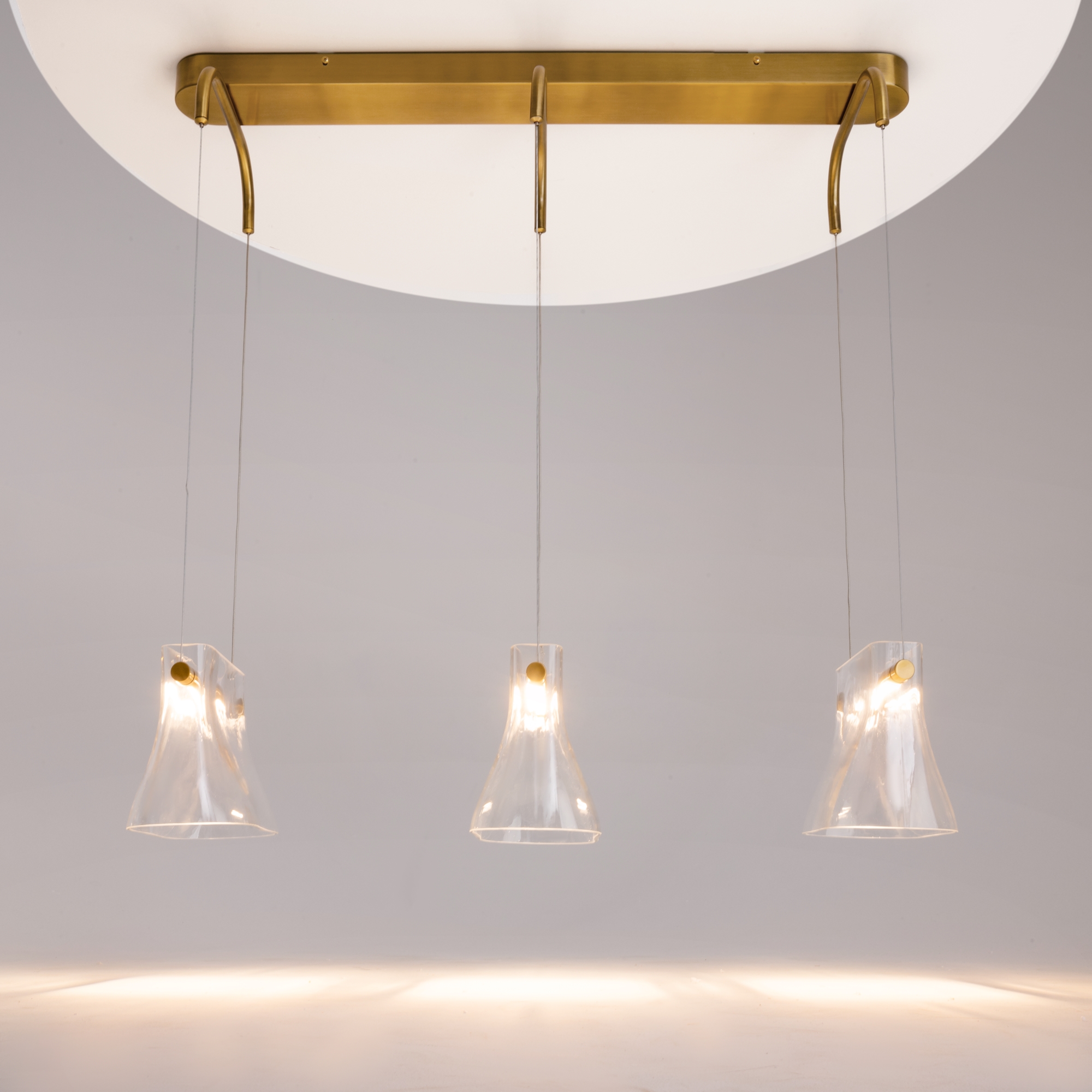 Цвет металлической арматуры — латунь с сатинированным финишем, плафоны — прозрачное стекло. Источник света: LED. Цветовая температура светильников 3000К, угол рассеивания — 120 градусов. Настенные бра и подвесные светильники оснащены регулируемым проводом длиной до 3 метров, что позволяет использовать их в помещениях с высокими потолками.