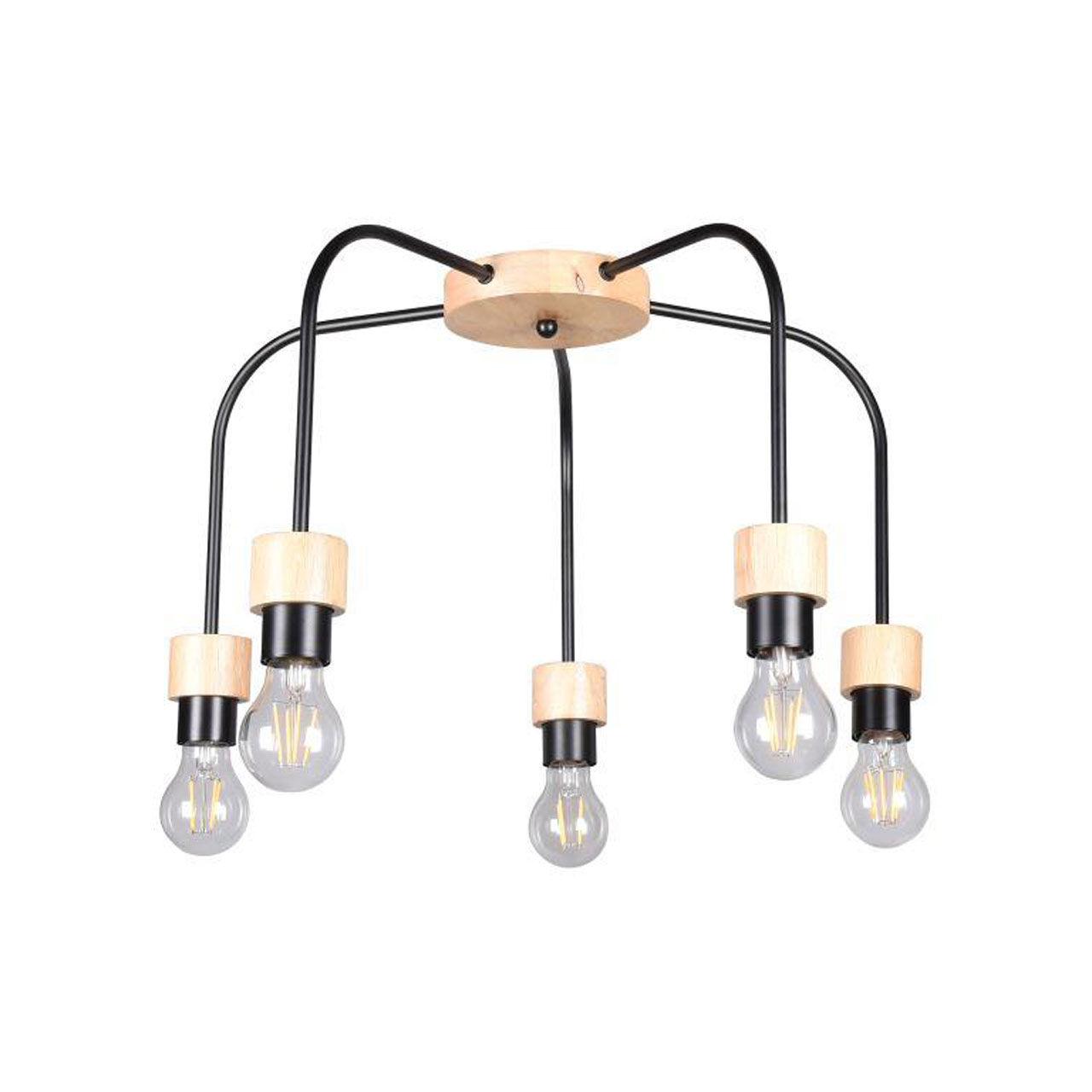 Металлическое основание потолочной люстры окрашено в черный цвет. Люстра декорирована элементами из натурального дерева.