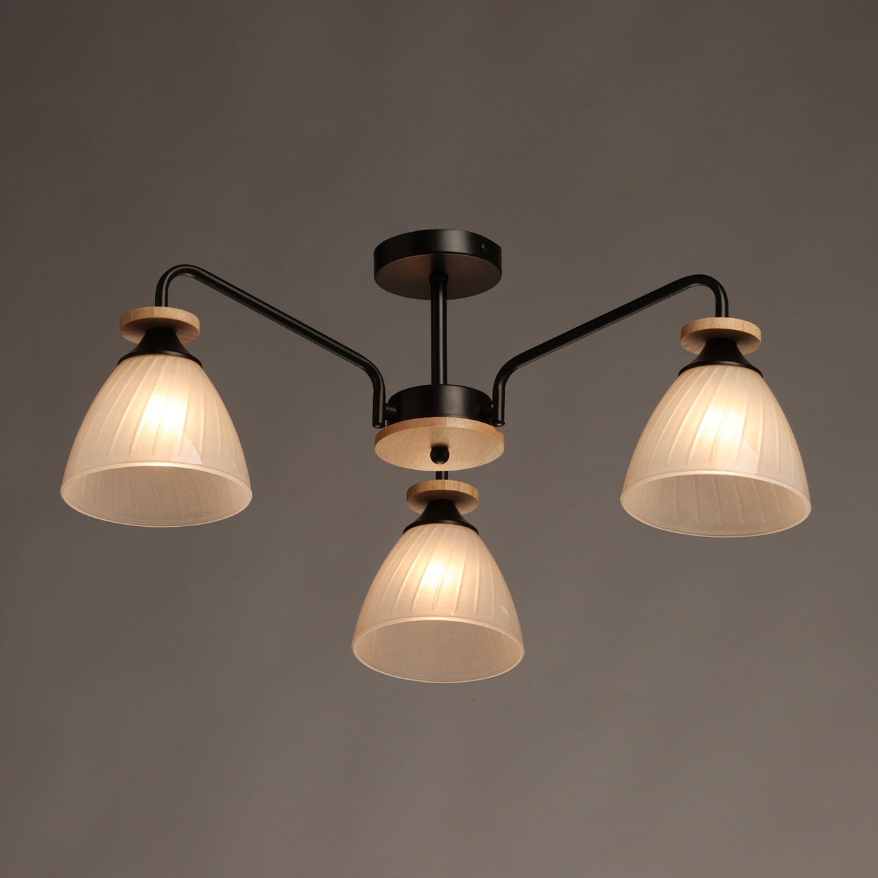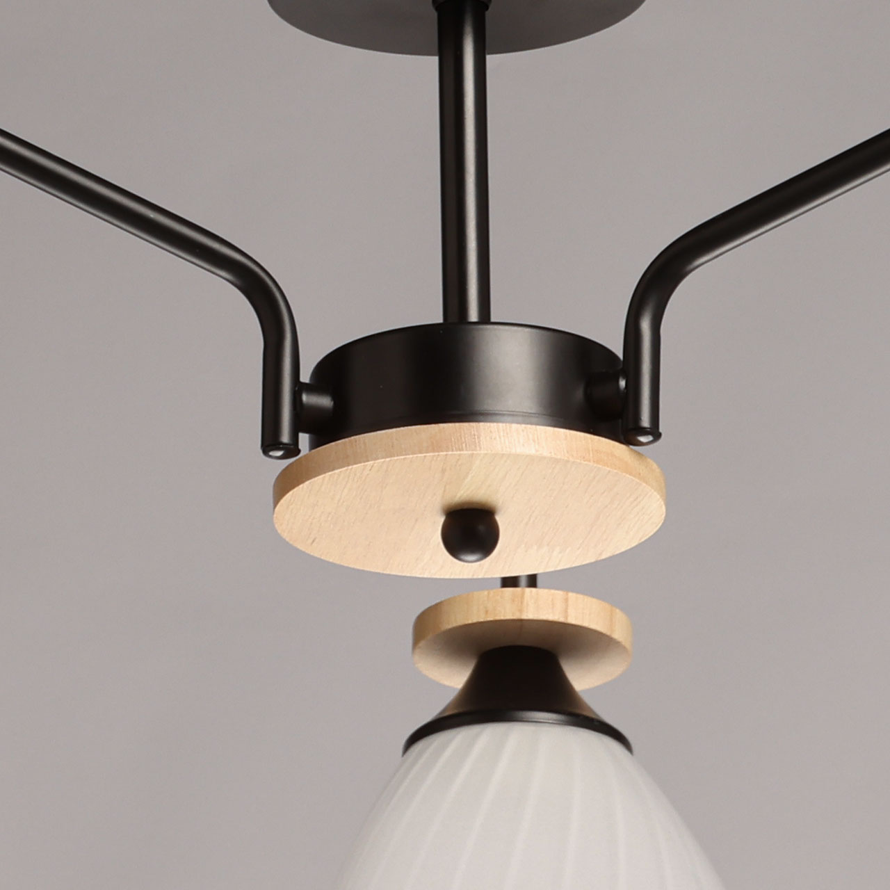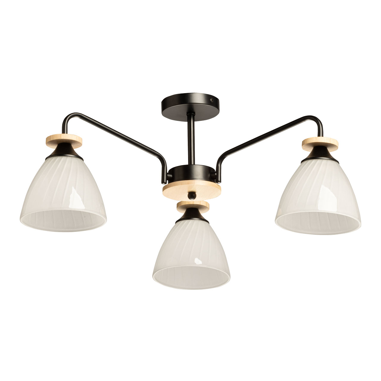 Металлическое основание потолочной люстры окрашено в черный цвет. Стеклянные плафоны отлиты в форму и окрашены в белый цвет с внутренней стороны. Светильник декорирован элементами из натурального светлого дерева.