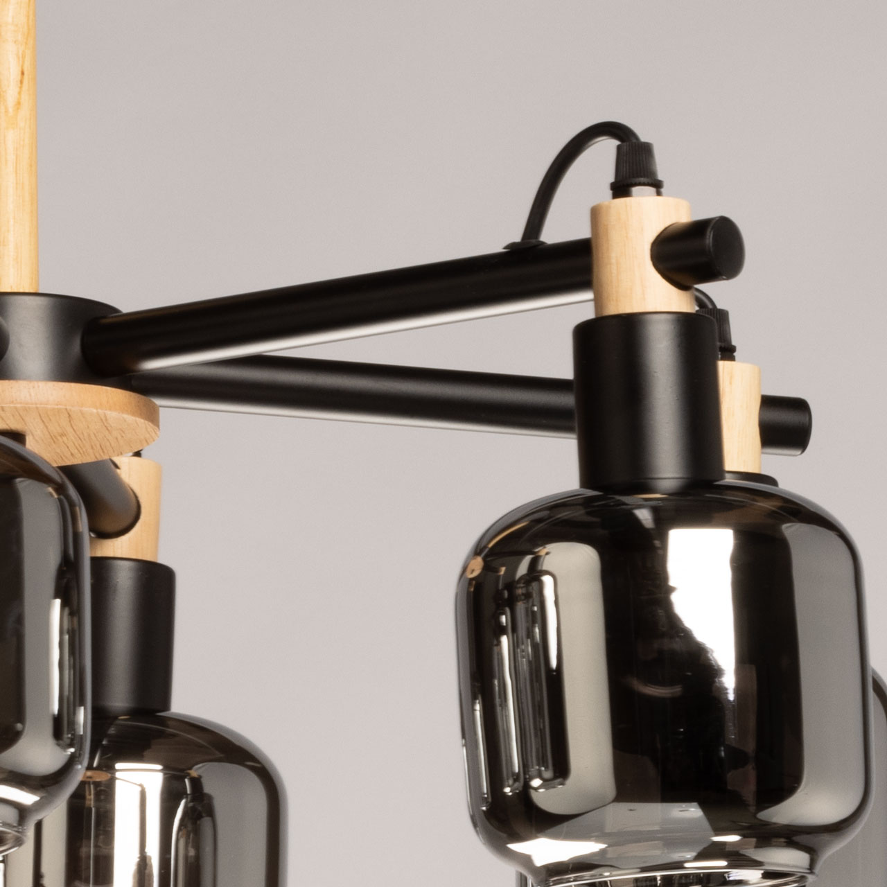 Металлическое основание потолочной люстры окрашено в черный цвет. Стеклянные плафоны отлиты в оригинальную форму и гальванизированы в дымчатый цвет. Потолочная люстра декорирована элементами из натурального светлого дерева.