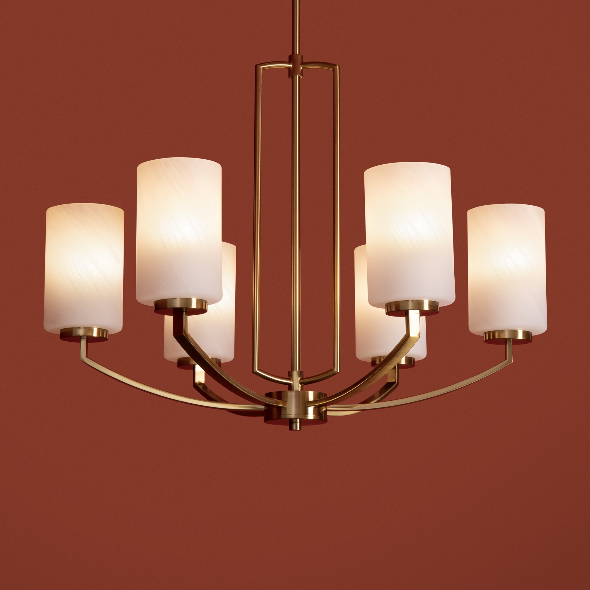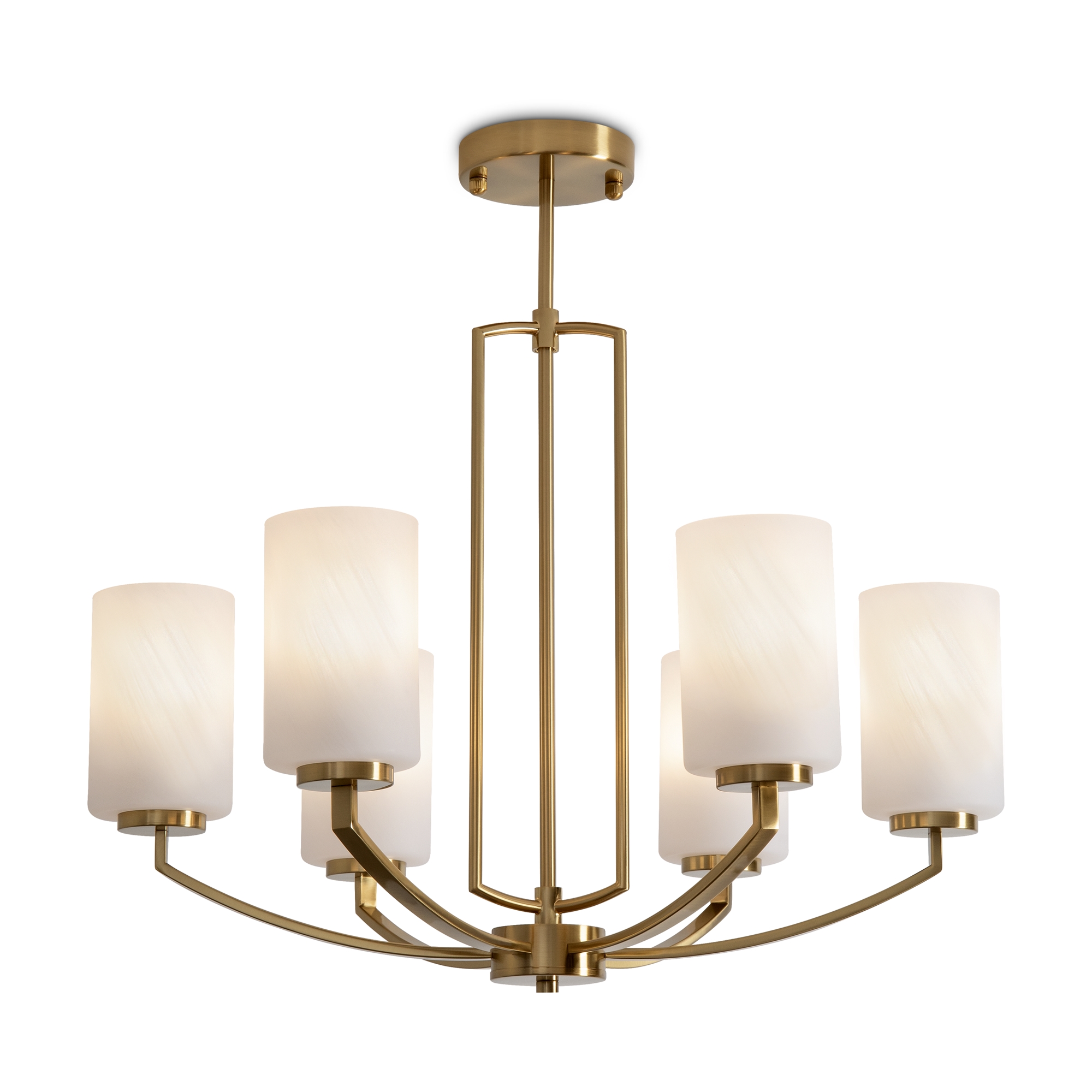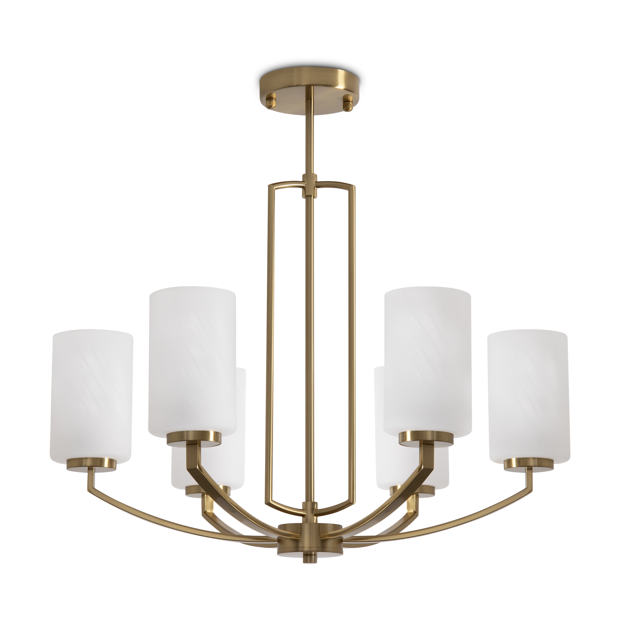Арматура — металл, латунь. Стеклянные белые абажуры рассеивают свет. Центральное основание создаёт воздушность конструкции. Лампы E14 (5/6 шт., не в комплекте).