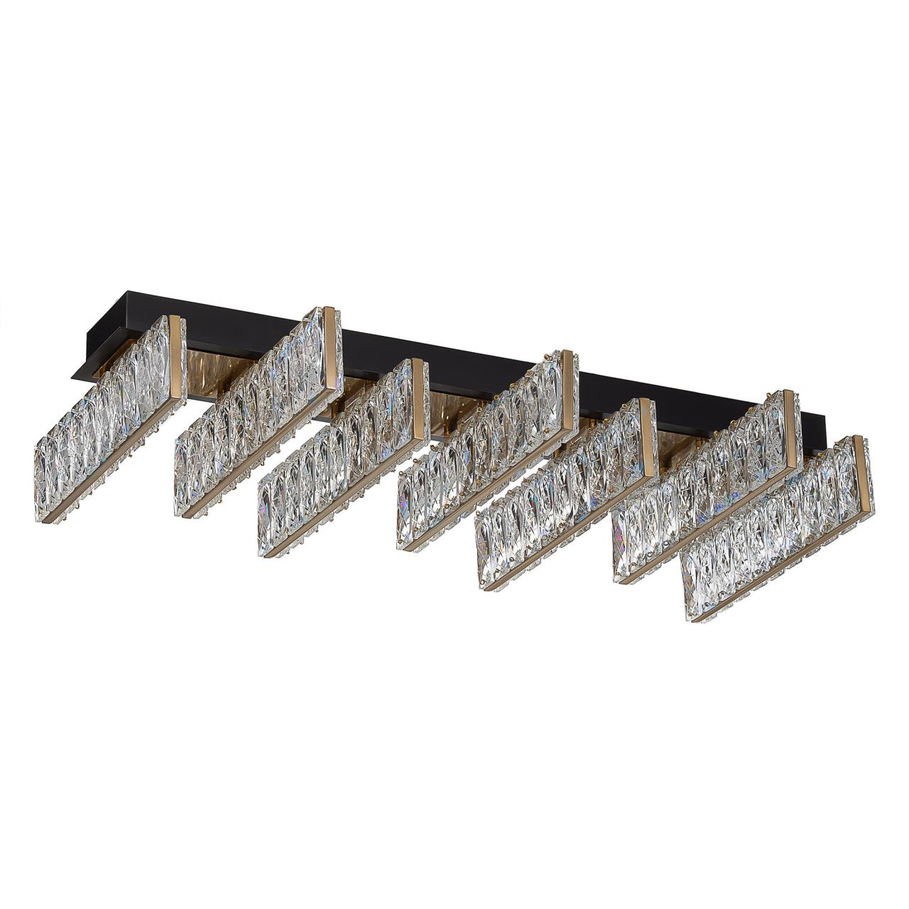 Каркас люстры — металлический, сочетаются черные и бронзовые элементы. На прямоугольном основании закреплены семь горизонтальных светодиодных модулей с хрустальным рассеивателем. Светодиодный свет с цветовой температурой 3000К мягко рассеивается в пространстве, играя на хрустальных гранях радужными искрами. Общая мощность люстры — 45Вт, ее можно установить на любой потолок, в том числе, натяжной.