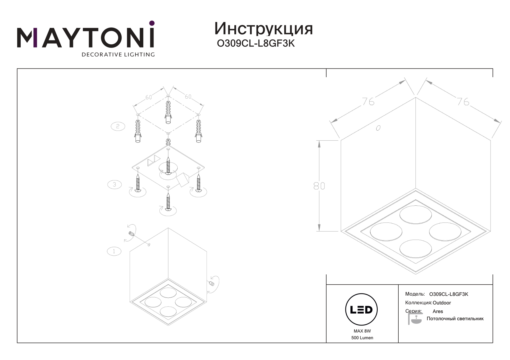 - Световой поток, lm: 500