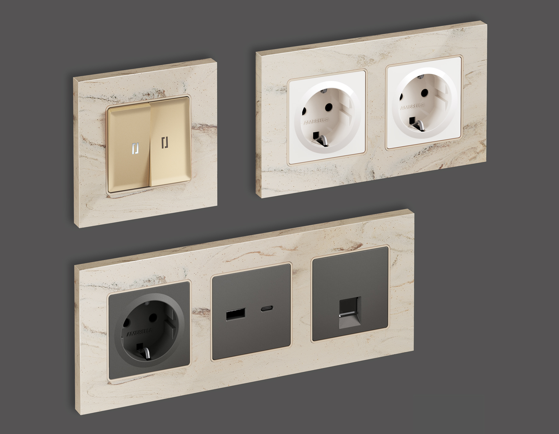 Многогранный ассортимент Ambrella Volt включает в себя механизмы, лицевые панели и рамки, а также комплекты, доступные в различных цветовых решениях. Продукция представлена в модульном исполнении, что позволяет гибко настраивать внешнийвид и функциональность. Вам будет легко заменить лицевую панель, рамку или механизм, найдя идеальное сочетание цветов.