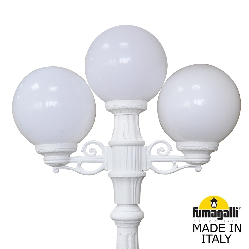 Садово-парковый фонарь FUMAGALLI серии GLOBE 250, модель GLOBE 250/RICU/BISSO 2L+1. Парковый торшер, столб RICU с двумя уличными фонарями - шарами GLOBE 250 на малых консолях BISSO смонтированными "вверх" и одним светильником - шаром по центру опоры освещения. Используются для архитектурного и ландшафтного освещения в стиле "классика". Место установки столбиков освещения - парковые дорожки, cкверы, садовые участки, тротуары, а так же ландшафтные и архитектурные объекты. Изготовлены в Италии, по уникальным технологиям "FUMAGALLI" из современного композитного полимера RESIN. Этот материал в 5 раз прочнее металла, не ржавеет, не окисляется, не выгорает на солнце, его не нужно красить. Все светильники пыле-влаго защищены по стандарту IP55 (Пыленепроницаемые, защита от водяных струй с любого направления). В комплекте идут крепежи и закладные элементы. Рассеиватель выполнен из антивандального, не мутнеющего и не горючего PMMA (ПолиМетилМетаАкрилат). Срок службы светильника - не менее 20 лет. Температура использования от -60 до +90. В серии GLOBE 250 есть фонари в настенном (BISSO/GLOBE 250, OFIR/GLOBE 250, MIRRA/GLOBE 250, PORPORA/GLOBE 250) подвесном (SICHEM/GLOBE 250) и наземном исполнении (IAFAET.R/GLOBE 250, ALOE.R/GLOBE 250, ARTU/GLOBE 250, GIGI/GLOBE 250, RICU/GLOBE 250, RICU/ISSO/GLOBE 250 1L, RICU/ISSO/GLOBE 250 2L, RICU/ISSO/GLOBE 250 3L) со столбами разной высоты, с разным количеством и конфигурацией голов. Консоли настенных фонарей и кронштейны светильников на столбах освщения могут устанавливаться вверх/вниз. Столбы выше 150 см имеют в основе мощную стальную трубу с двойной оцинковкой. При заказе требуется выбрать цвет корпуса, цвет плафона и тип патрона. По стилю и дизайну серия уличных светильников GLOBE 250 похожа на светильники большого размера GLOBE 400 и на светильники среднего размера GLOBE 300.