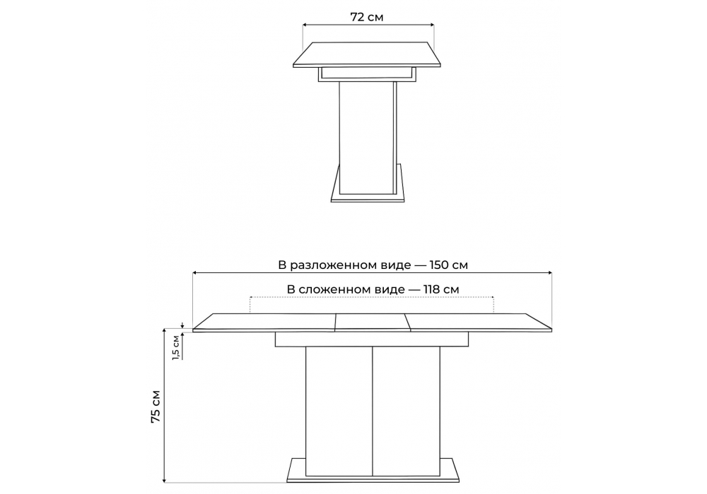 Материал каркаса - ЛДСП; Материал столешницы - ЛДСП; Ширина - 72,5; Высота - 75,5; Длина стола в разложенном виде - 150; Длина - 118;