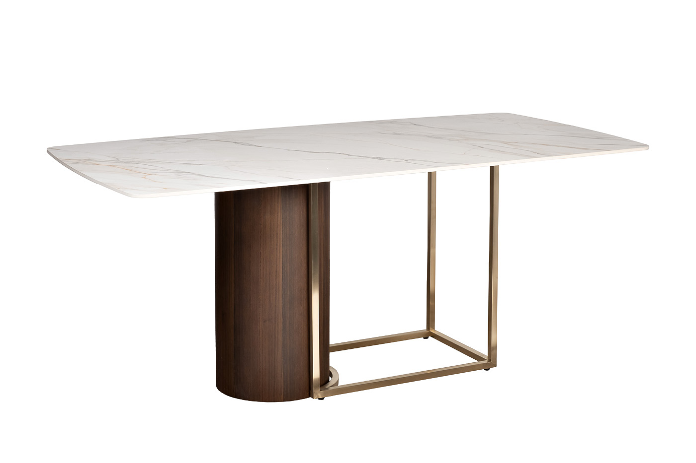 Столешница изготовлена из глянцевого керамогранита с мраморным узором, и обладает высокими характеристиками износостойкости, что является несомненным преимуществом для обеденного стола. Особенностью этой модели является сочетание трех фактур - белой столешницы с мраморным узором и золотого основания с отделкой из натурального шпона, а также асимметрия основания. Все в этой мебели говорит о высоком статусе и безупречном вкусе. Garda Decor предлагает купить современный обеденный стол, а также стулья или кресла, которые дополнят его и составят достойную компанию.