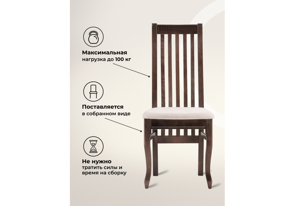 Материал каркаса - массив дерева; Материал сиденья - ткань; Материал обивки - ткань; Ширина - 45; Глубина - 55; Высота - 102; Ширина сиденья - 42; Глубина сиденья - 44; Высота сиденья - 46;