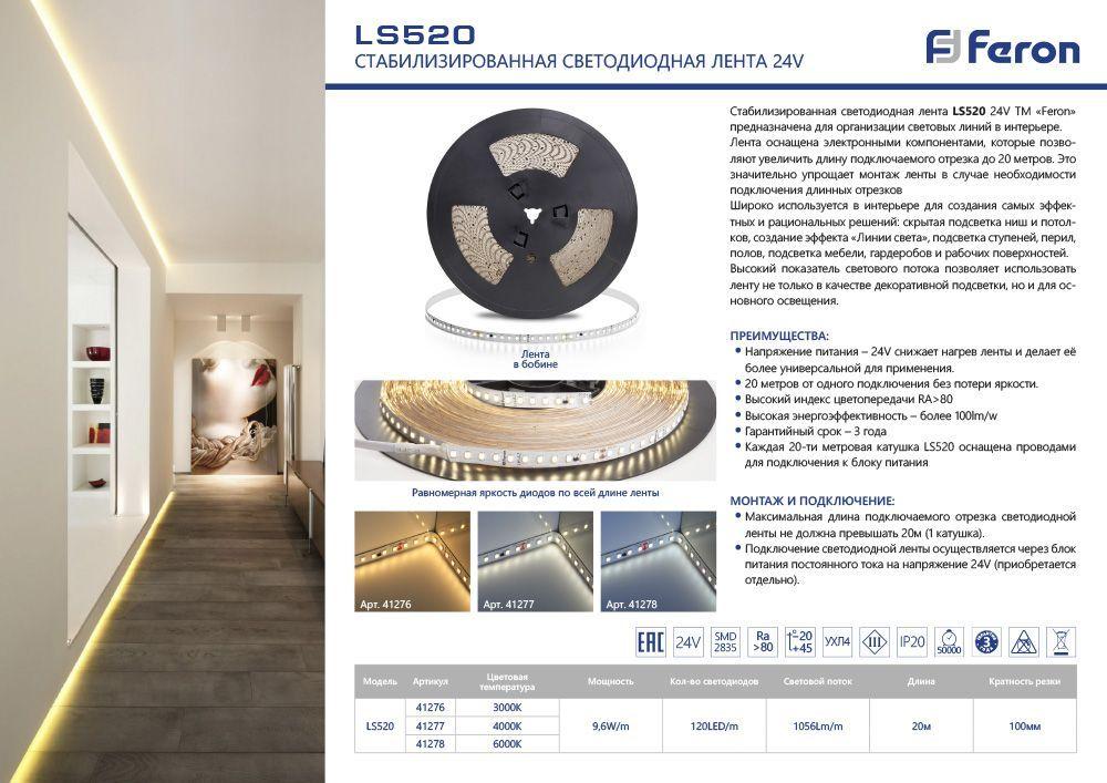 Светодиодная лента Feron 9, 6W/m 120LED/m 2835SMD белый 20M LS520 41277 в Орле