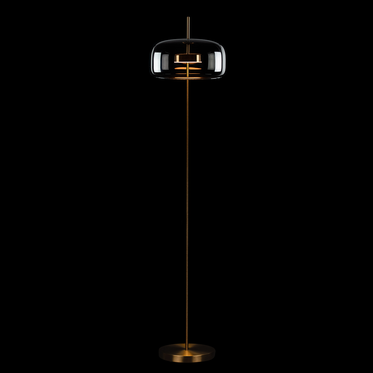 Элегантный торшер с горизонтально вытянутым плафоном из графитового стекла отличается сдержанным характером и архитектурной выразительностью. Полупрозрачное стекло приглушает свет, создавая мягкое, равномерное свечение и ощущение визуальной глубины. Внутренний элемент подчёркивает симметрию формы и добавляет композиции утончённый акцент.