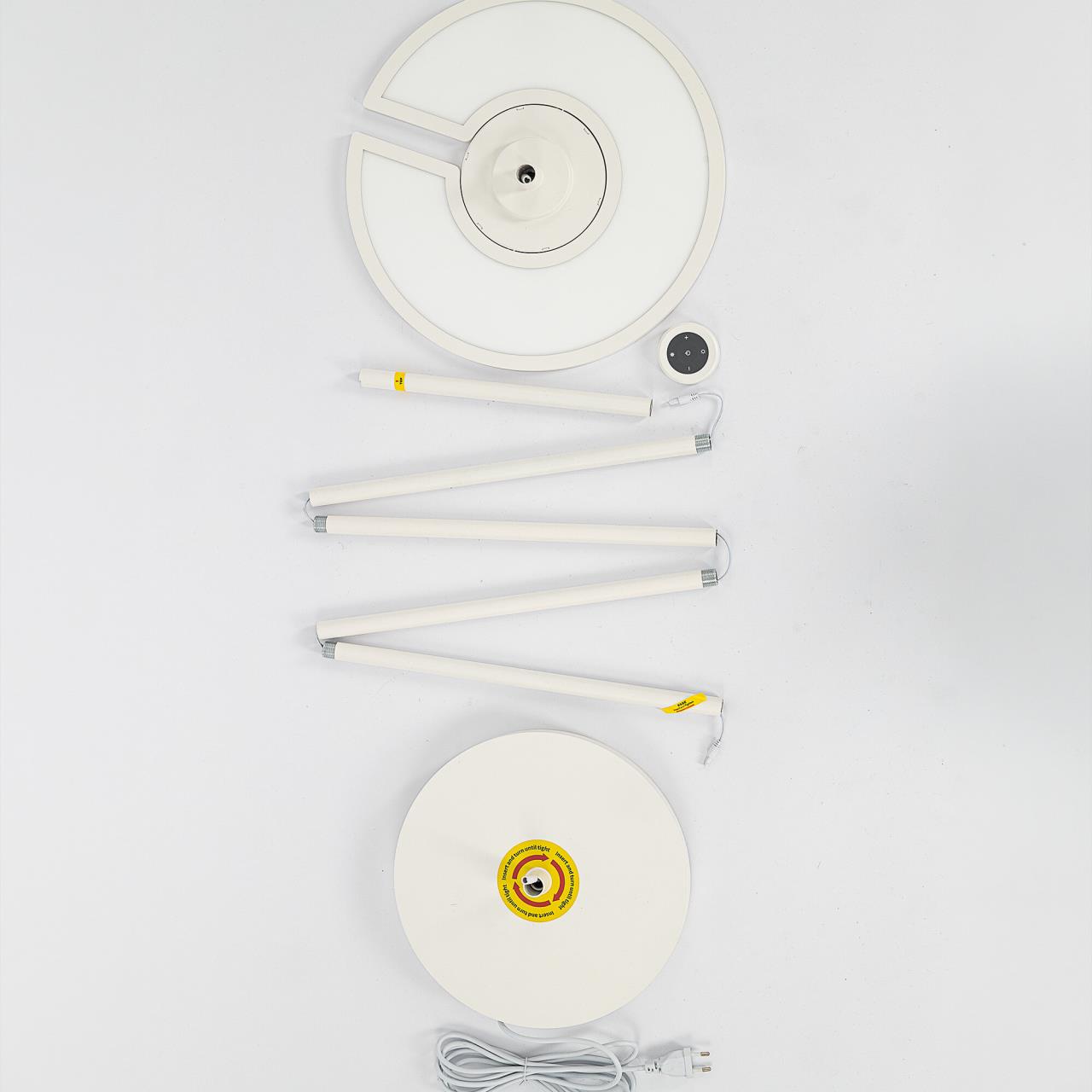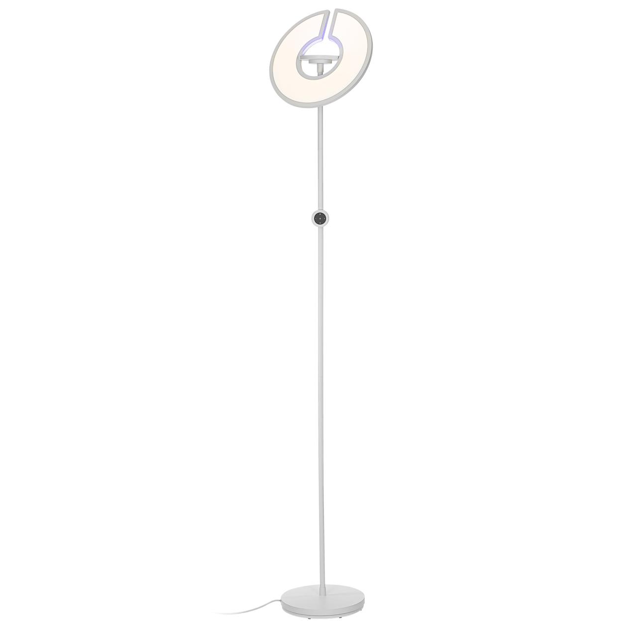 Основание и стойка торшера — из металла, окрашенного белой матовой краской. Рассеиватель — из специализированного оптического полимера, основной модуль имеет поворотную конструкцию. При этом основной свет обеспечивает равномерное, комфортное для глаз освещение без мерцания и пульсаций, а дополнительный RGB‑модуль открывает безграничные возможности для экспериментов с цветом. Мощность основного модуля — 40Вт, rgb-подсветки — 6Вт.