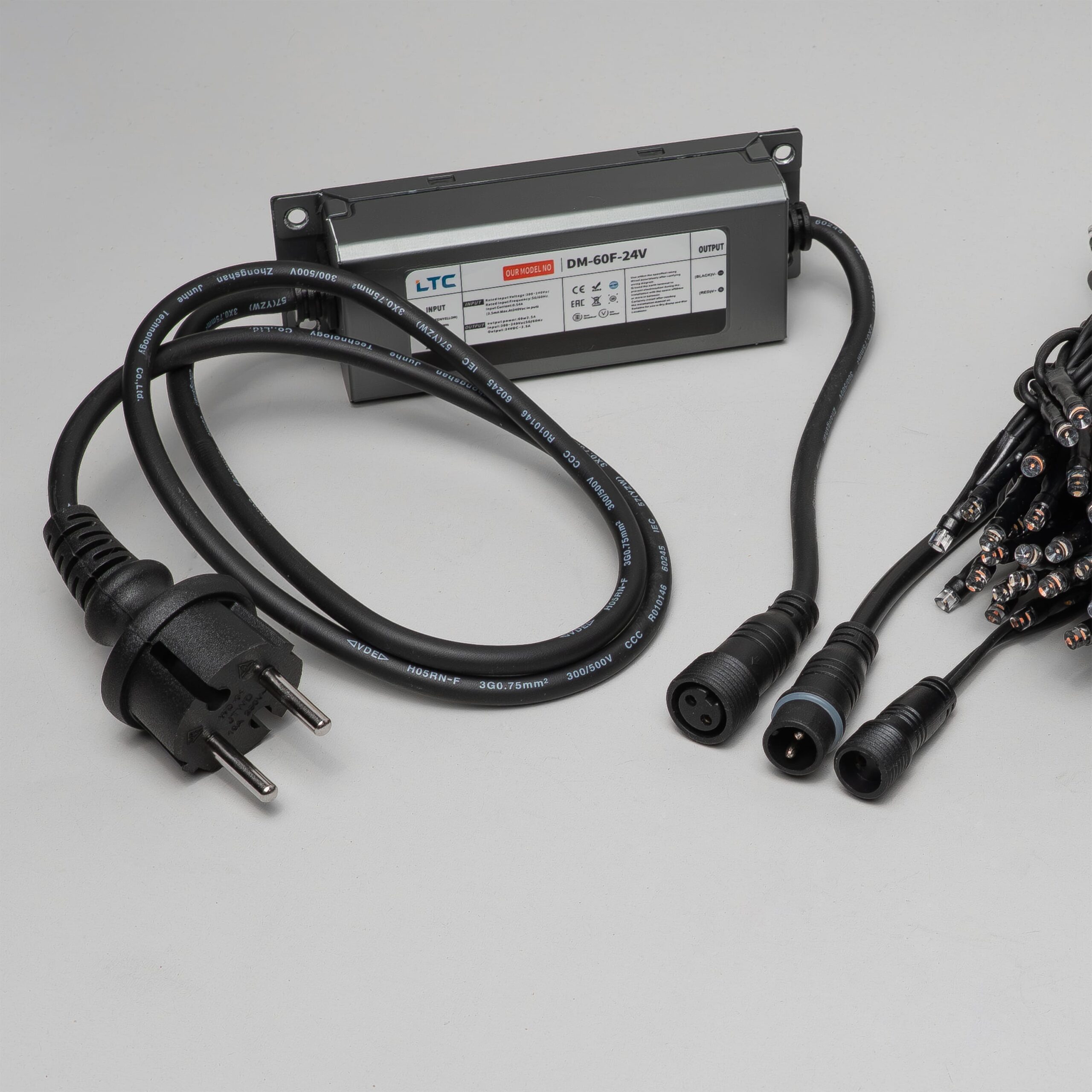 Купить "Комплект 3 Разноцветных Нити по 20м, 600 LED, Провод Черный Каучук 2,3мм, IP54 LTC ECO600-1-1M"