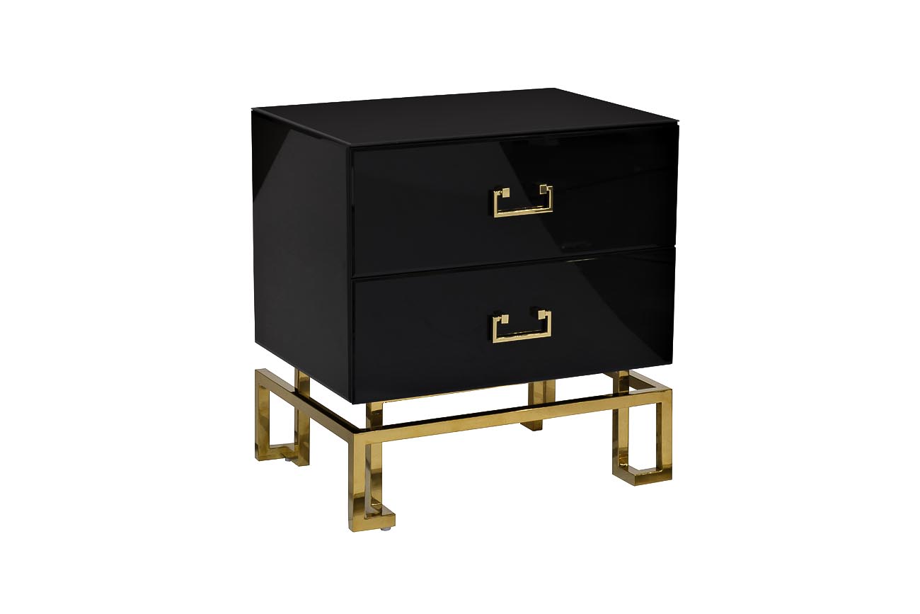 Представленная черная тумбочка станет гармоничным дополнением помещения в классическом стиле или стиле ар-деко, нео-классика. Черная тумбочка с ящиками идет на золотых металлических ножках оригинальной формы, из аналогичного ножкам материала выполнена фурнитура – ручки на 2х ящиках. Особую прелесть модели придают панели из черного стекла, из-за чего она выглядит очень роскошно. Дизайнерскую прикроватную тумбочку можно устанавливать у кровати в спальне, возле массивного стола в рабочем кабинете, у дивана в гостиной. Тумба прекрасно сочетается с комодом арт. KFG057, консолью арт. KFG058 и зеркалами арт. KFG047, арт. KFE1270