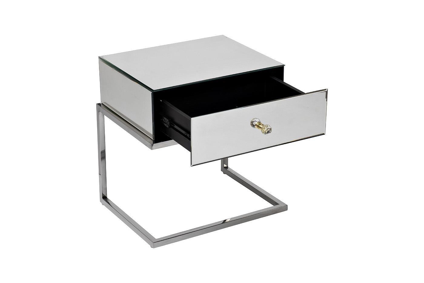 Оригинальная тумбочка на металлическом каркасе привлекает внимание необычной формой – вместо традиционных ножек здесь стальная рама с хромированным блеском. Выглядит такая конструкция весьма интересно и современно. Если ищите нестандартную мебель для спальни в современной стилистике, зеркальная тумбочка станет отличным выбором. Визуально легкая, эффектная, практичная и устойчивая, она украсит собой пространство не только спальни, но и прихожей, коридора, холла.